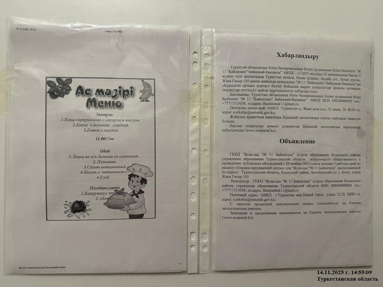 По проекту: РАЗДЕЛ «Охрана окружающей среды» для Государственное коммунальное казенное предприятие "Ясли-сад "№ 11 Байшешек" отдела образования Келесского района управления образования Туркестанской области расположенной по адресу: Туркестанская область, Келесский район, Актобинский с.о. с. Бозсу, улица Жана Гасыр 105