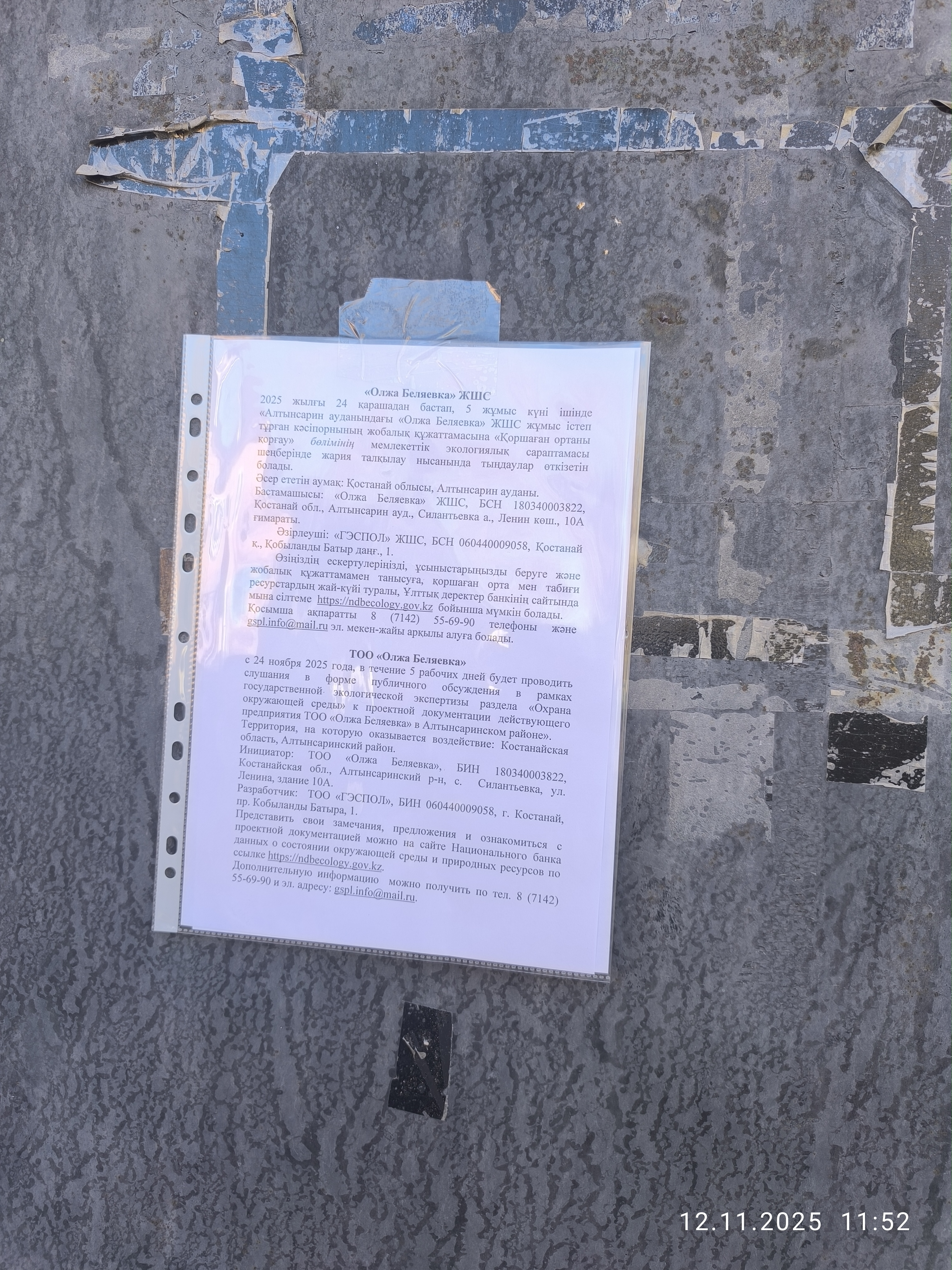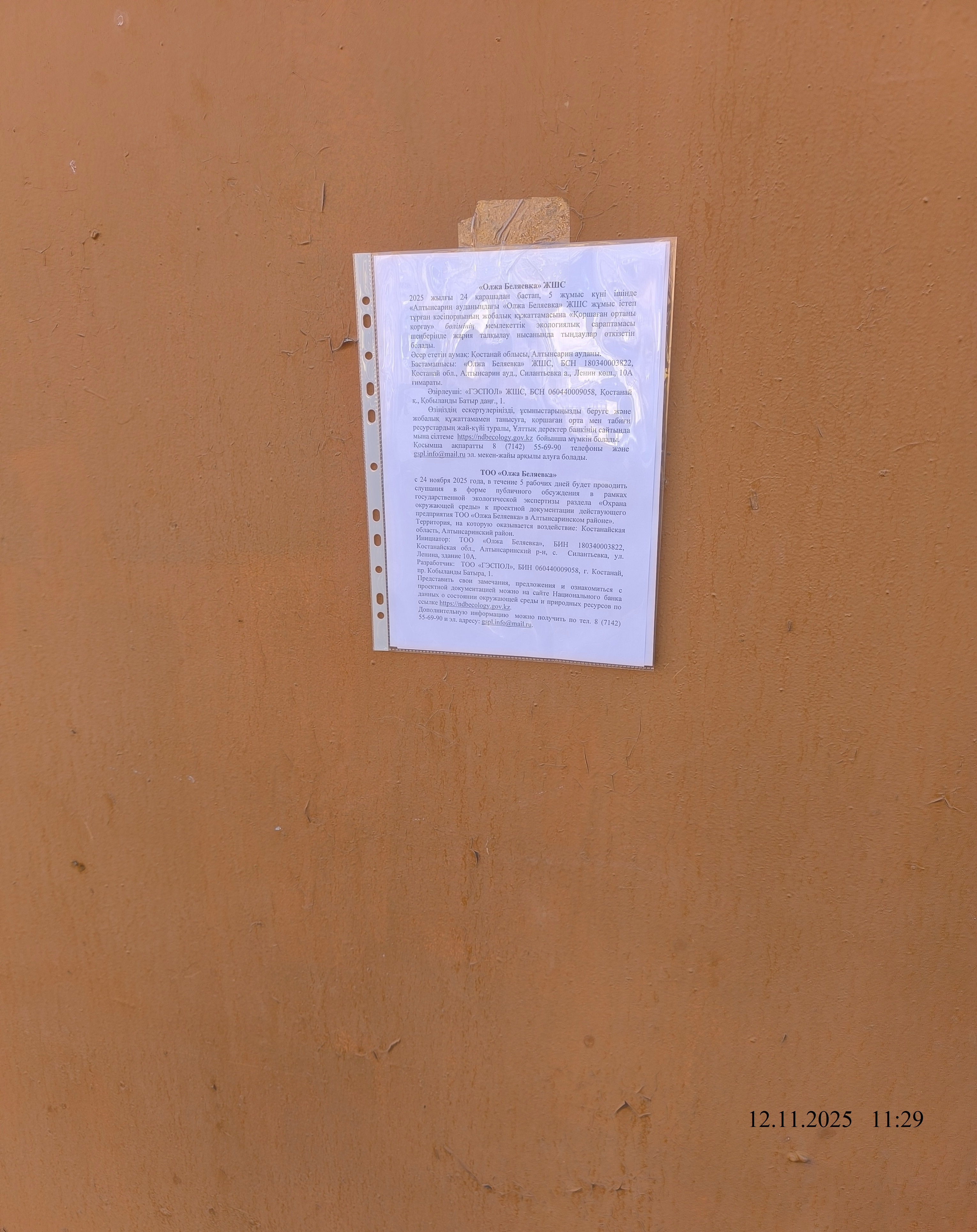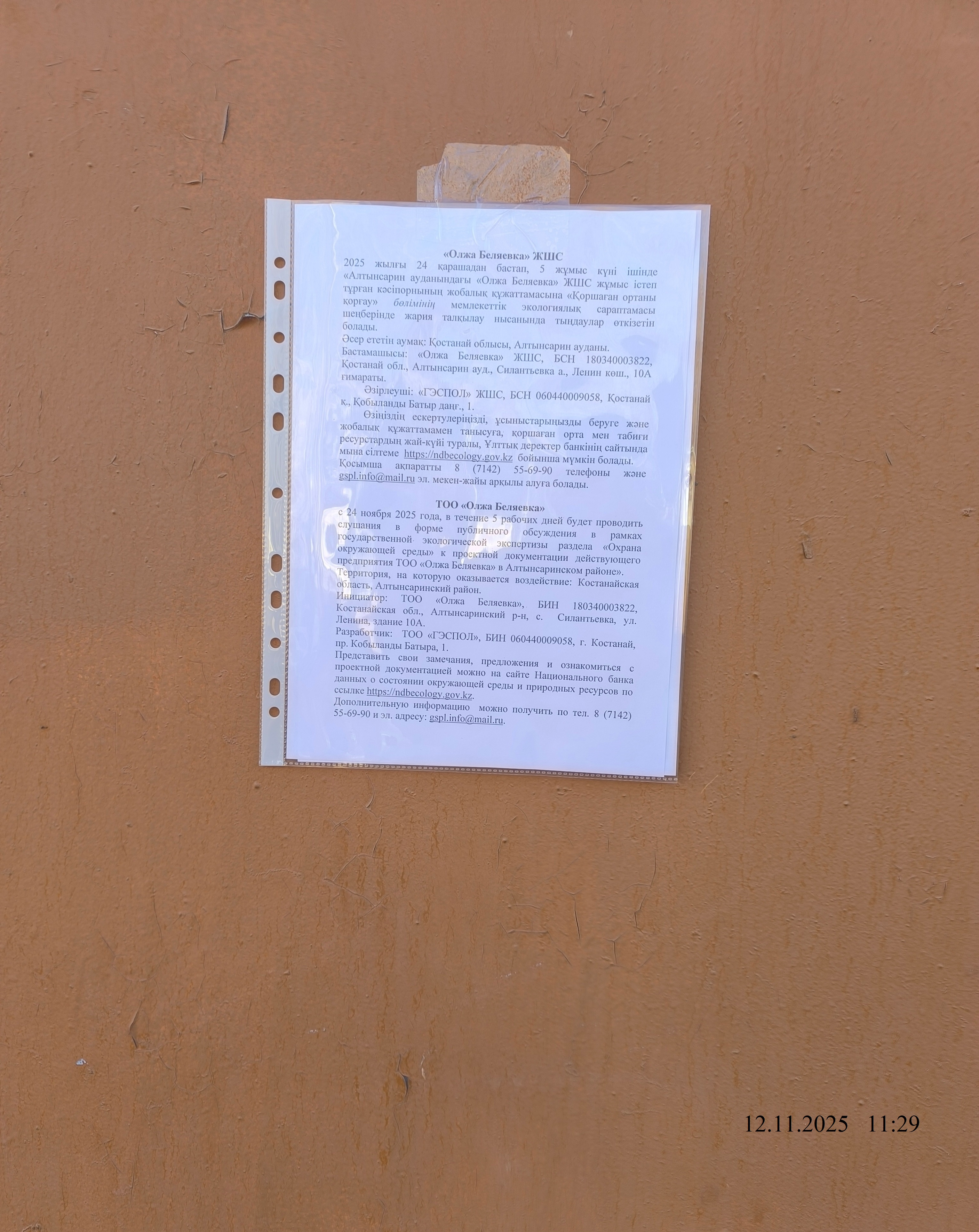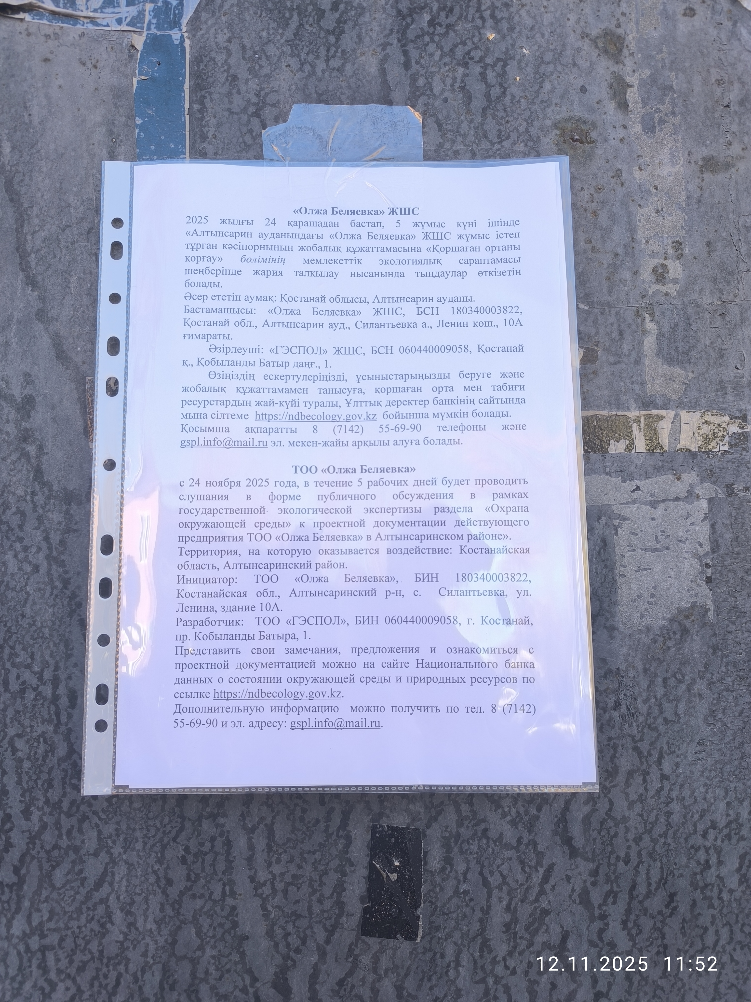 По проекту: Раздел «Охрана окружающей среды» к проектной документации действующего предприятия ТОО «Олжа Беляевка» в Алтынсаринском районе.