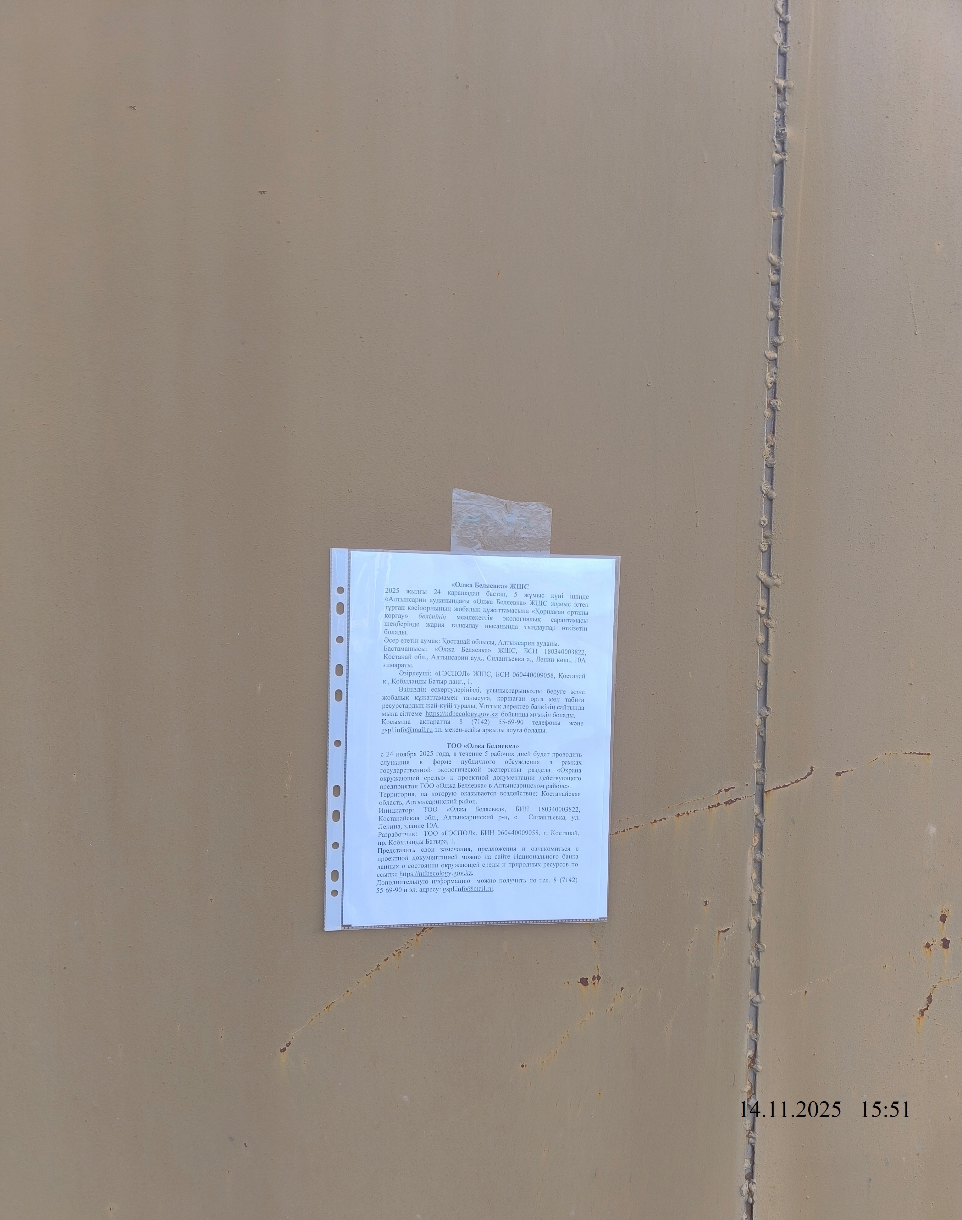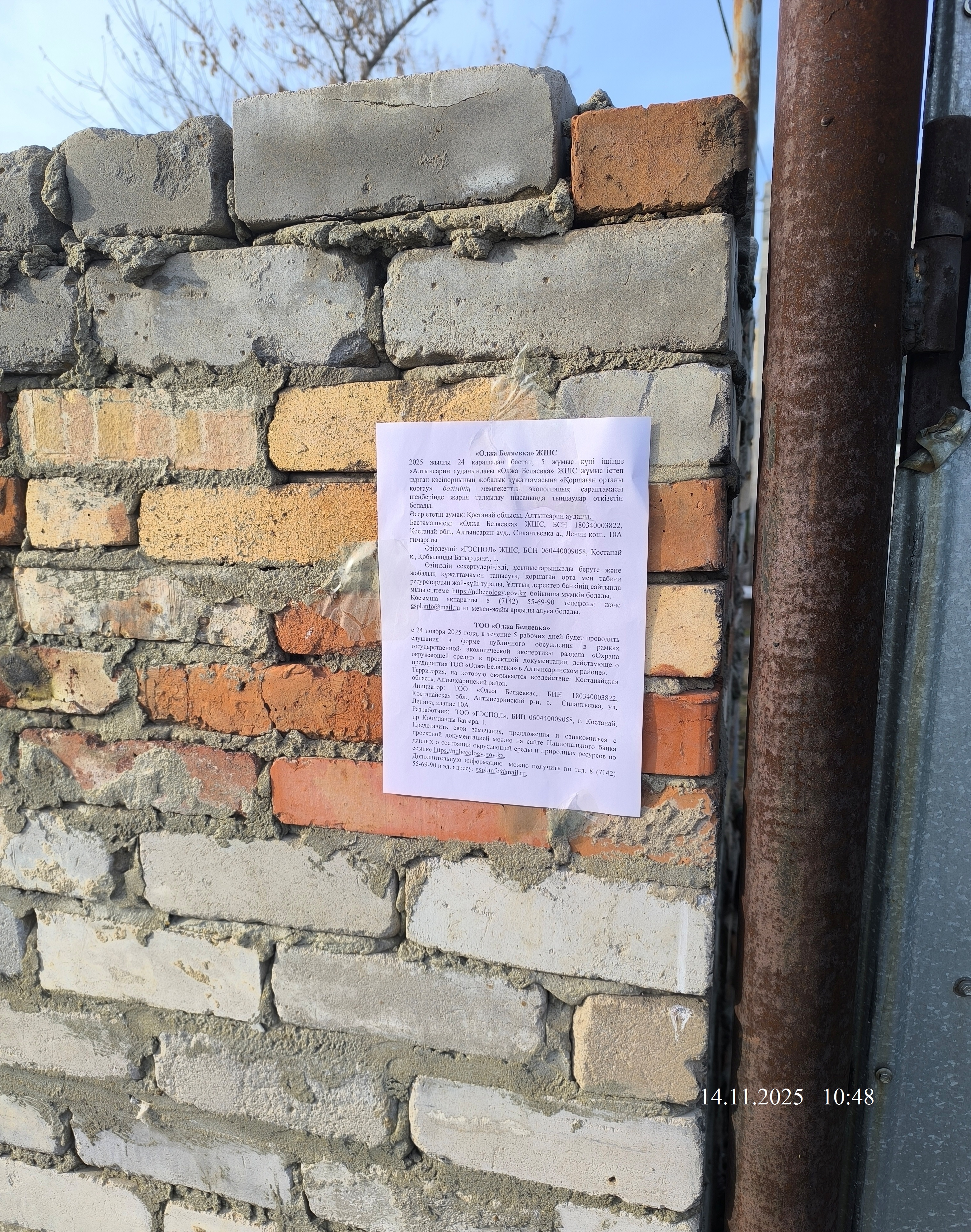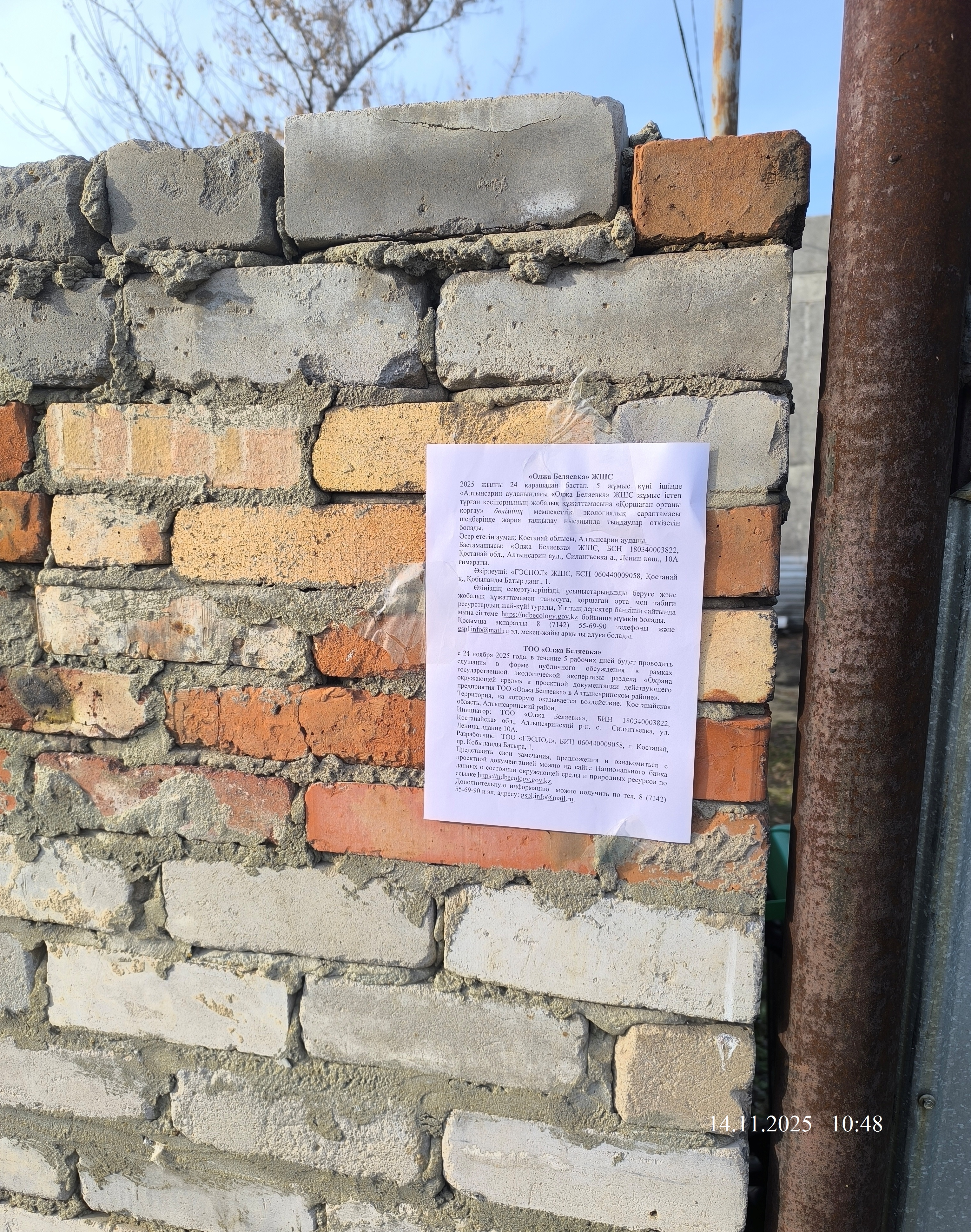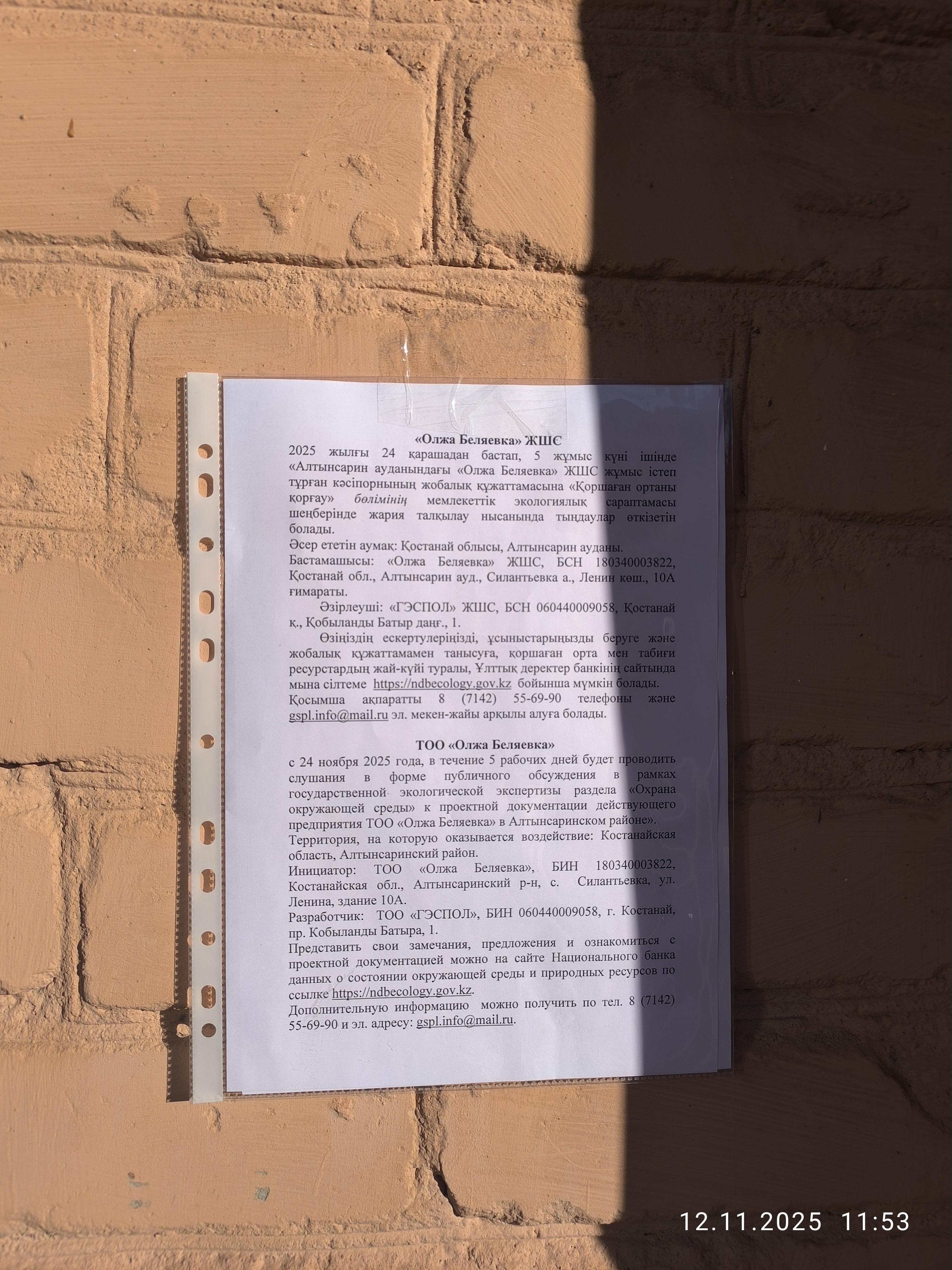 По проекту: Раздел «Охрана окружающей среды» к проектной документации действующего предприятия ТОО «Олжа Беляевка» в Алтынсаринском районе.