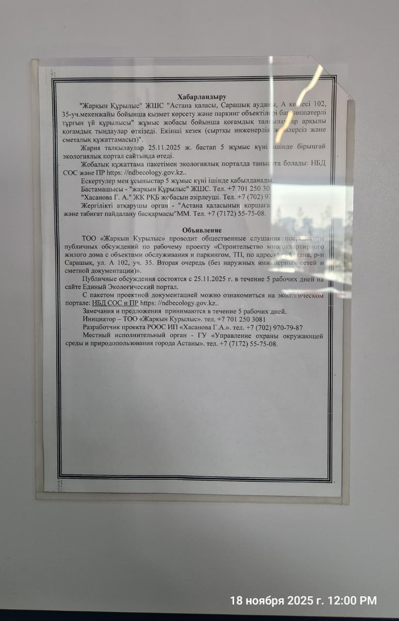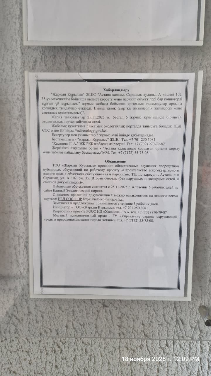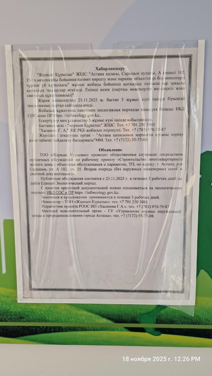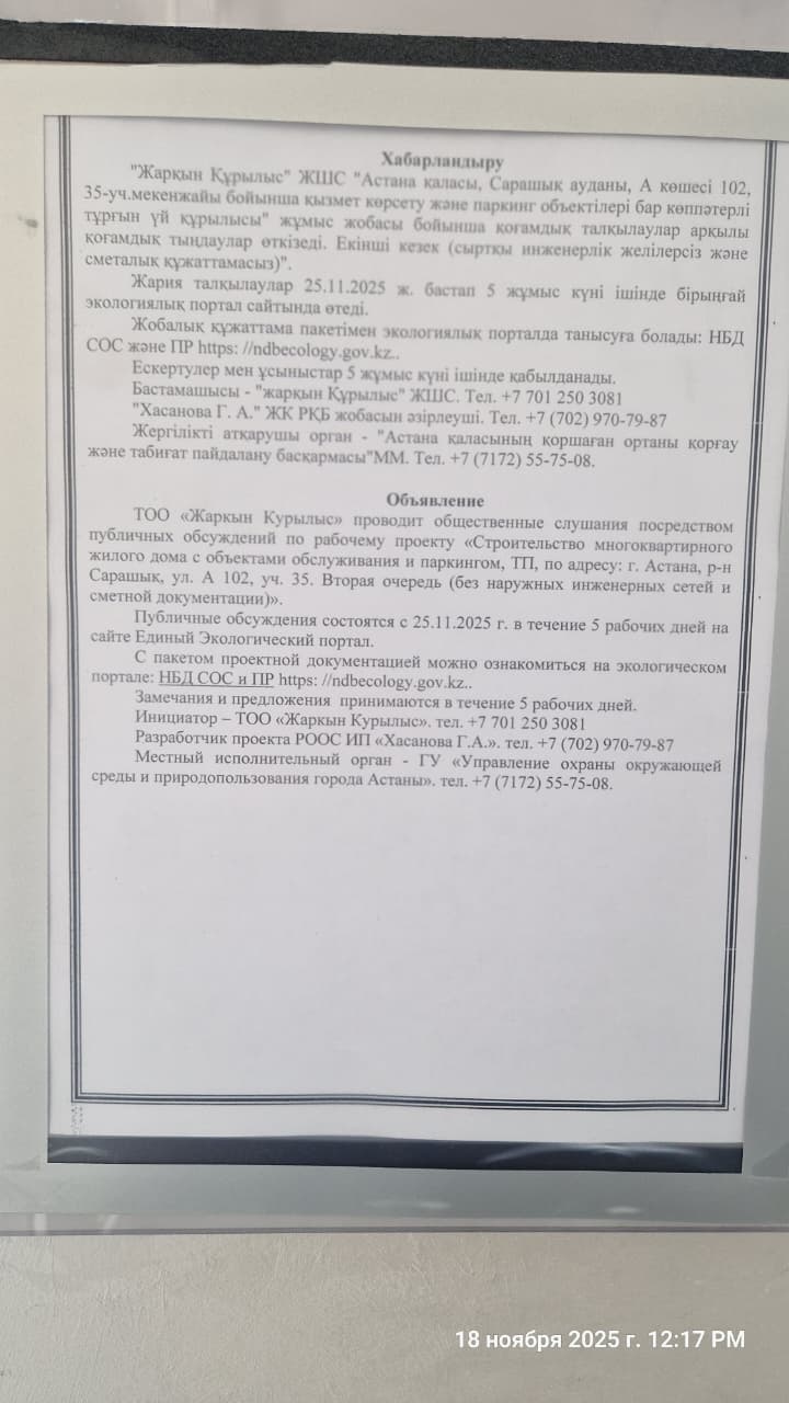 По проекту: РАЗДЕЛ «ОХРАНА ОКРУЖАЮЩЕЙ СРЕДЫ» к рабочему проекту «Строительство многоквартирного жилого дома с объектами обслуживания и паркингом, ТП, по адресу: г. Астана, р-н Сарашық, ул. А 102, уч. 35. Вторая очередь (без наружных инженерных сетей и сметной документации)»