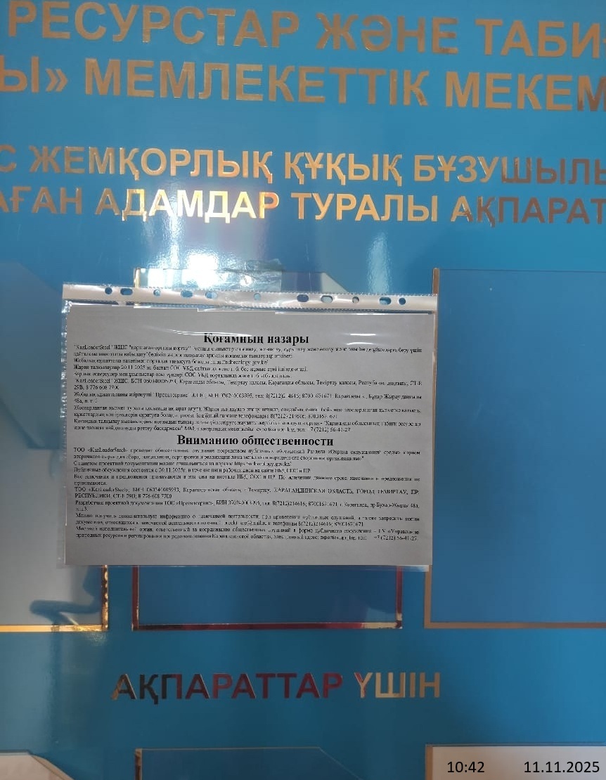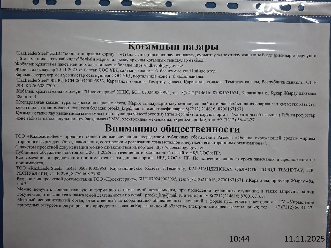 По проекту: Раздел охраны окружающей среды «ТОО «KAZLEADERSTEEL», прием вторичного сырья для сбора, накопления, сортировки и реализации лома металлов и передачи его сторонним организациям
