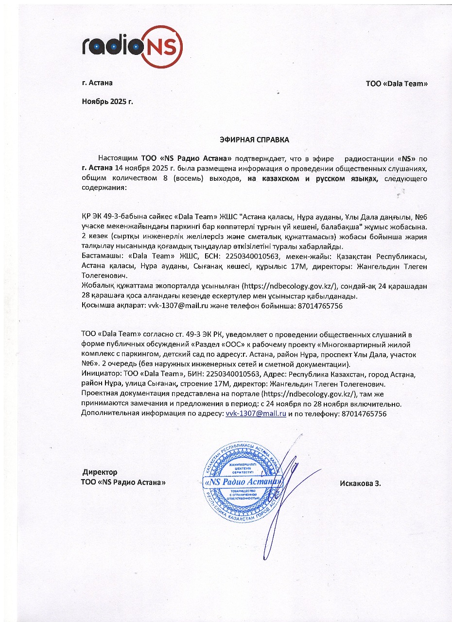 По проекту: «Многоквартирный жилой комплекс с паркингом, детский сад по адресу:г. Астана, район Нұра, проспект Ұлы Дала, участок №6». 2 очередь (без наружных инженерных сетей и сметной документации)