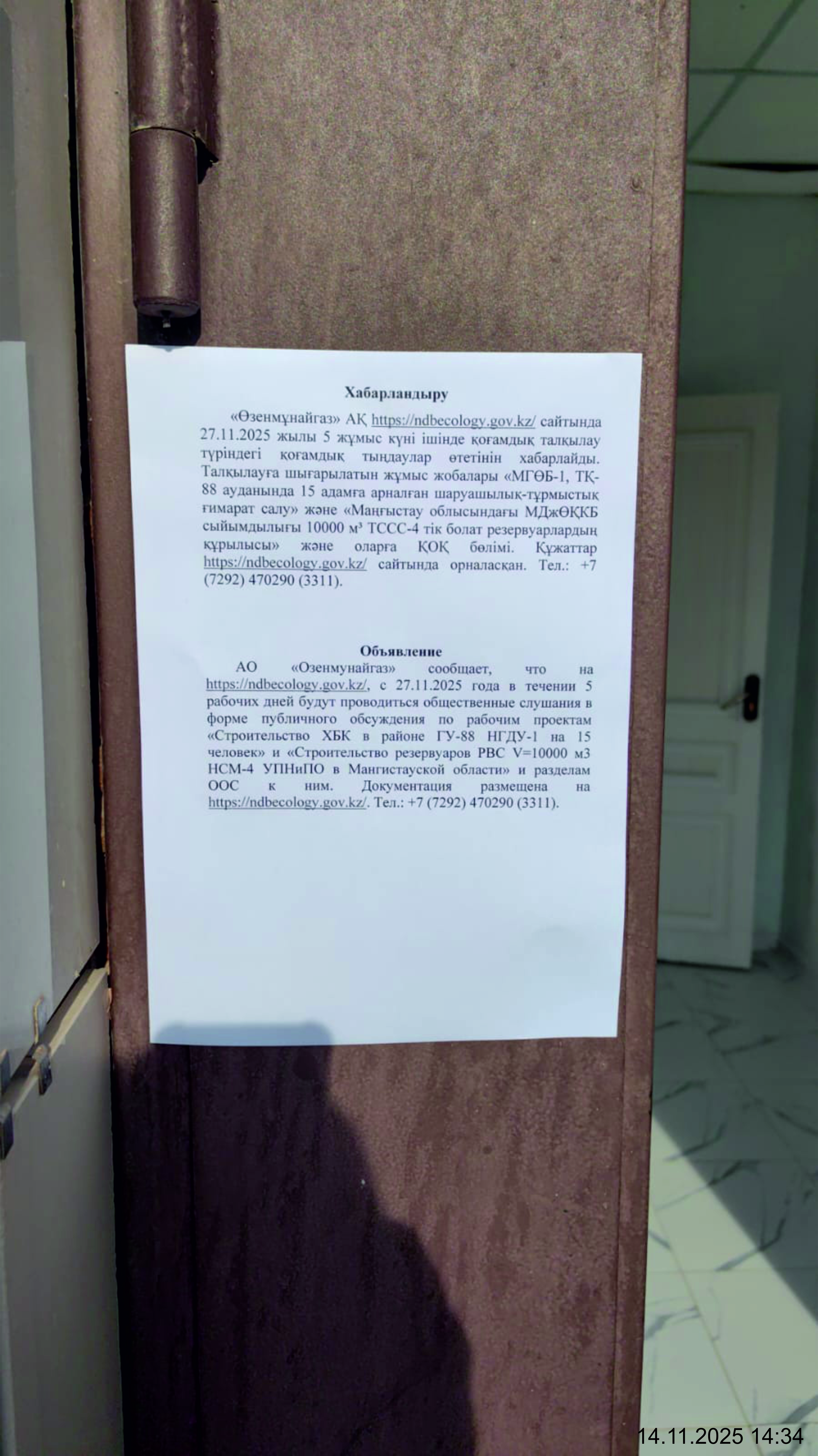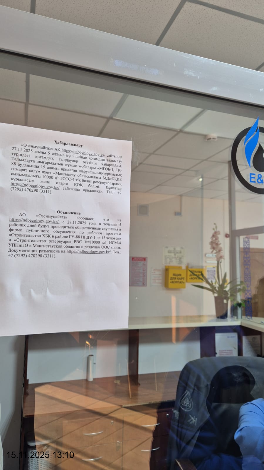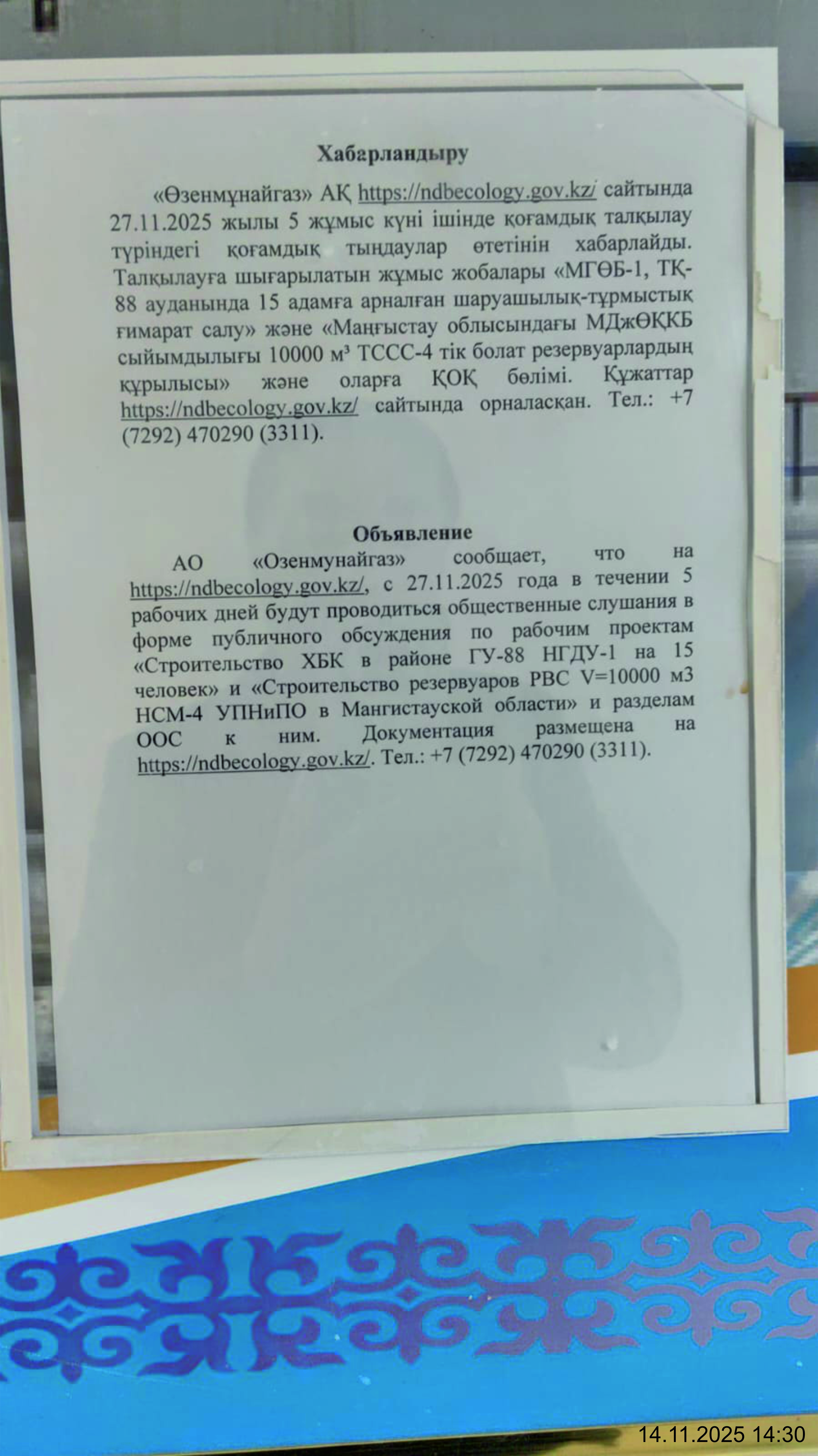 По проекту: Раздел ООС к рабочему проекту «Строительство резервуаров РВС V=10 000 м3 НСМ-4 УПНиПО в Мангистауской области»