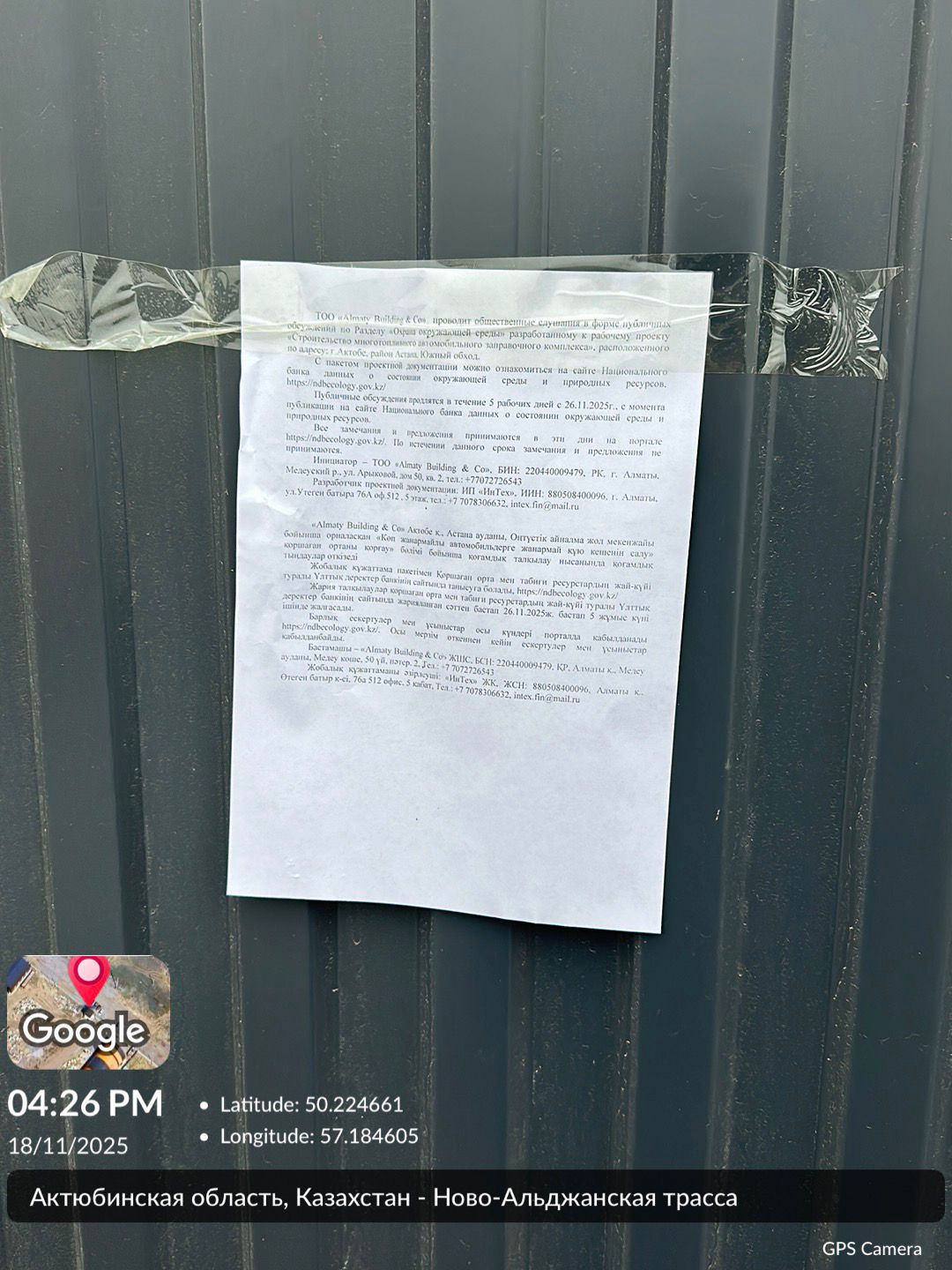 По проекту: Раздел «Охрана окружающей среды» к рабочему проекту «Строительство многотопливного автомобильного заправочного комплекса», расположенного по адресу: г.Актобе, район Астана, Южный обход