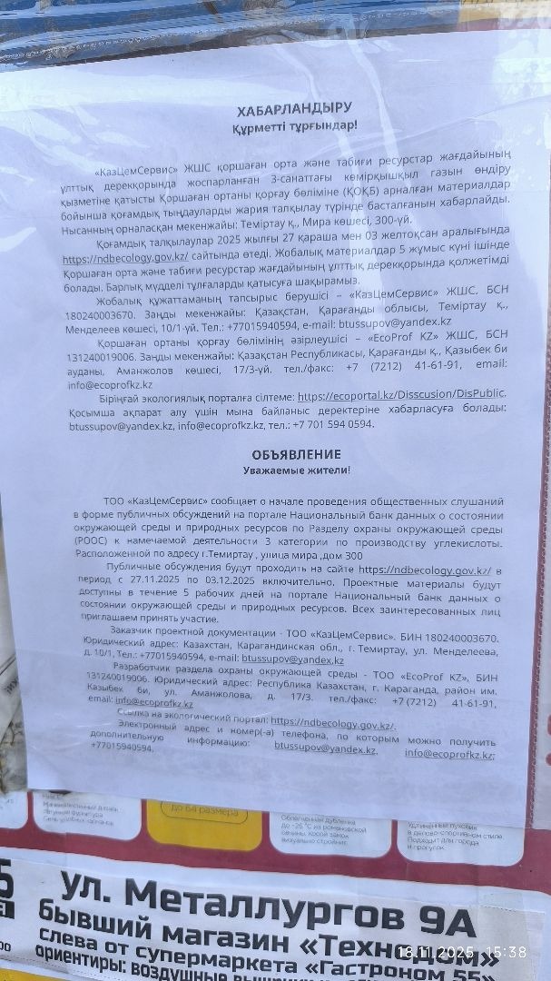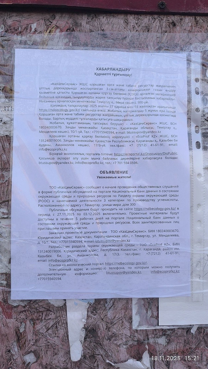 По проекту: Раздел охраны окружающей среды (РООС) к намечаемой деятельности 3 категории по производству углекислоты. Расположенной по адресу г.Темиртау , улица мира, дом 300