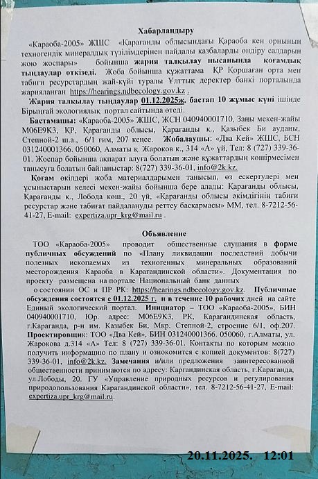 По проекту: «План ликвидации последствий добычи полезных ископаемых из техногенных минеральных образований месторождения Караоба в Карагандинской области»