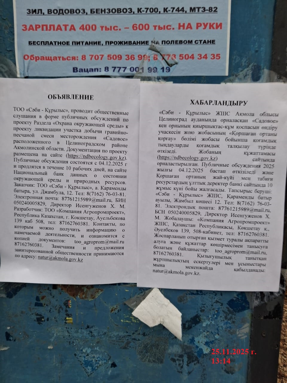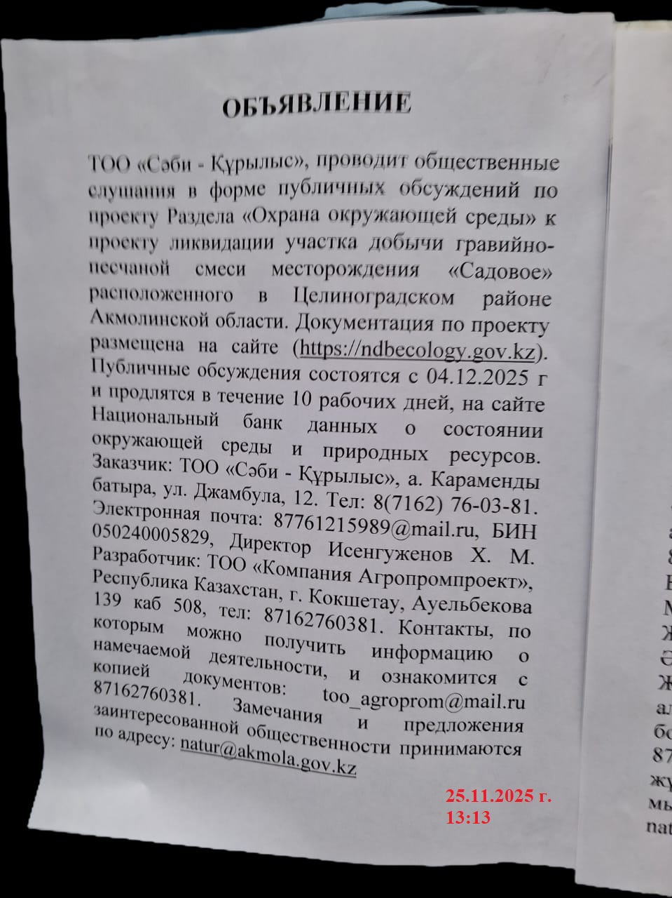 По проекту: Раздел «Охраны окружающей среды» к «проекту ликвидации участка добычи гравийно-песчаной смеси месторождения «Садовое», расположенного в Целиноградском районе, Акмолинской области».