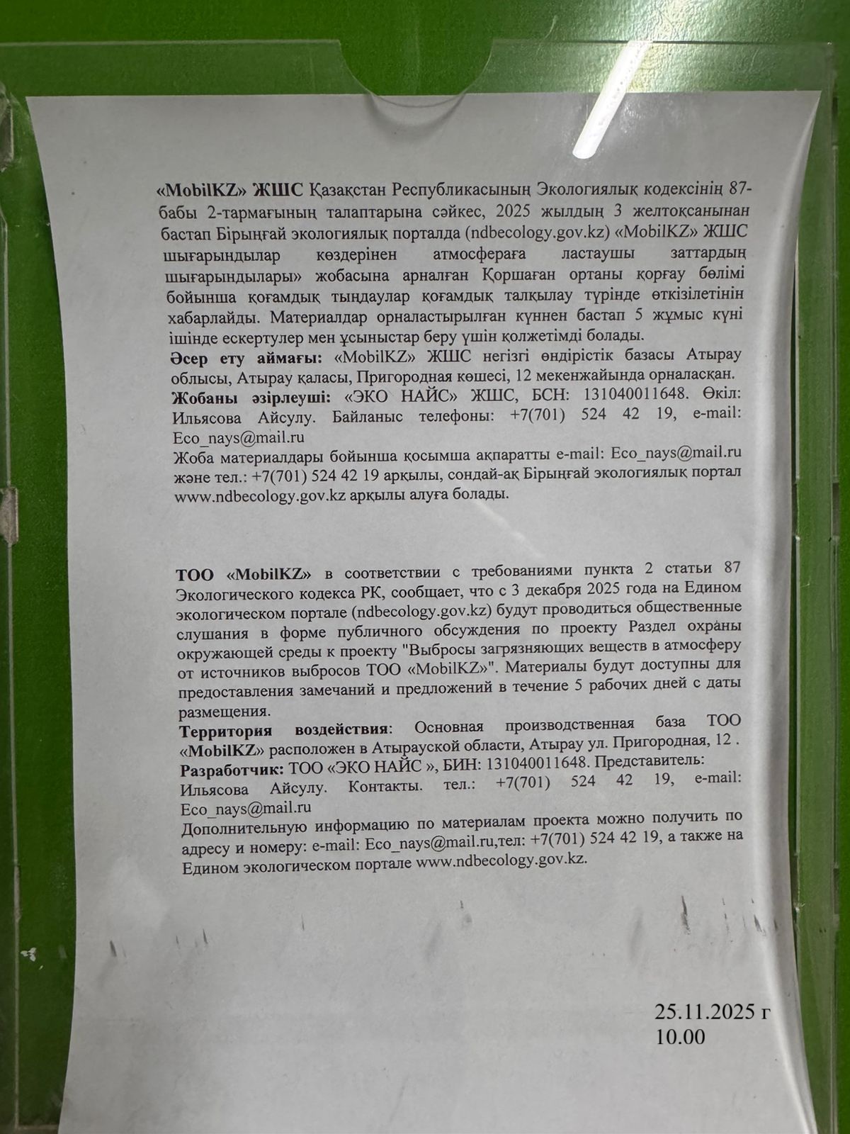 По проекту: Выбросы загрязняющих веществ в атмосферу от источников выбросов ТОО «MobilKZ»» эксплуатация