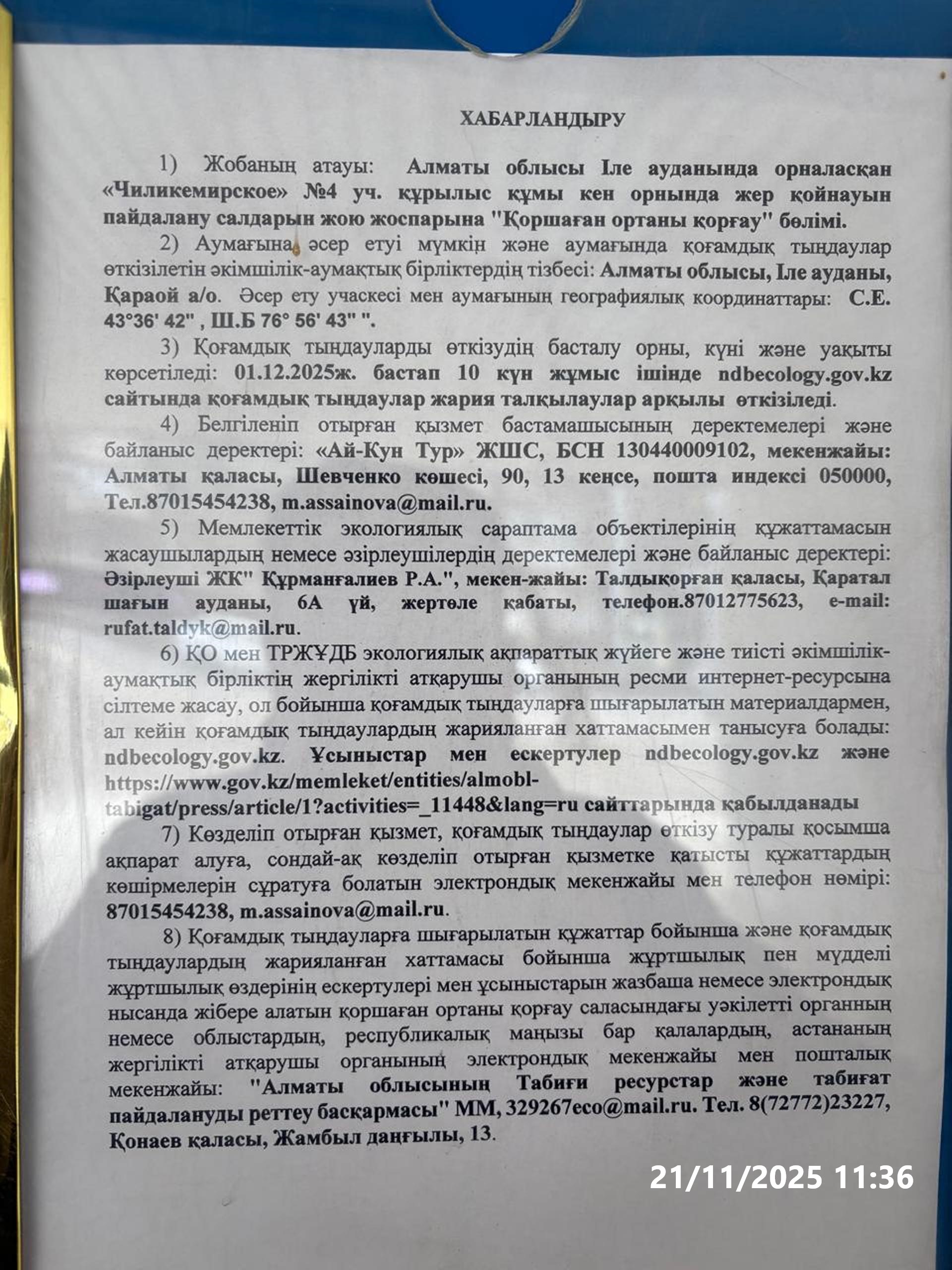 По проекту: План ликвидации последствий недропользования на месторождении строительного песка «Чиликемирское» уч.№4, расположенном в Илийском районе Алматинской области