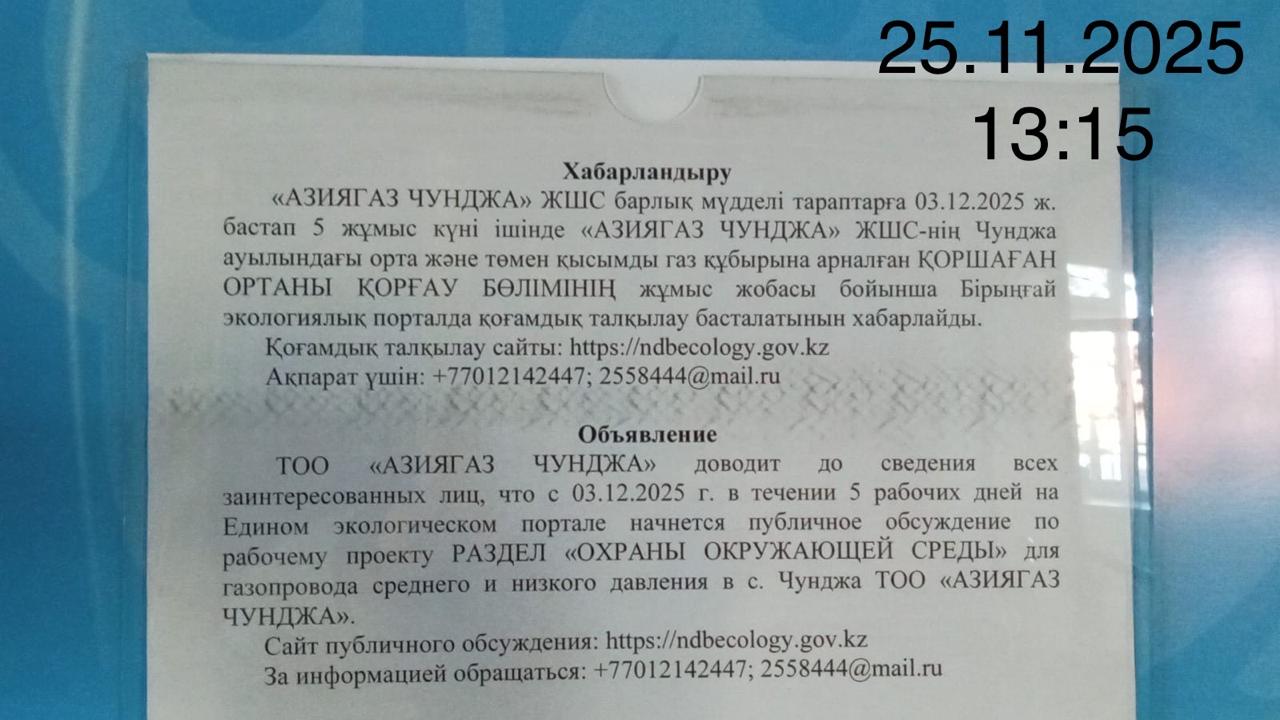 По проекту: РАЗДЕЛ «ОХРАНЫ ОКРУЖАЮЩЕЙ СРЕДЫ» для газопровода среднего и низкого давления в с. Чунджа ТОО «АЗИЯГАЗ ЧУНДЖА»
