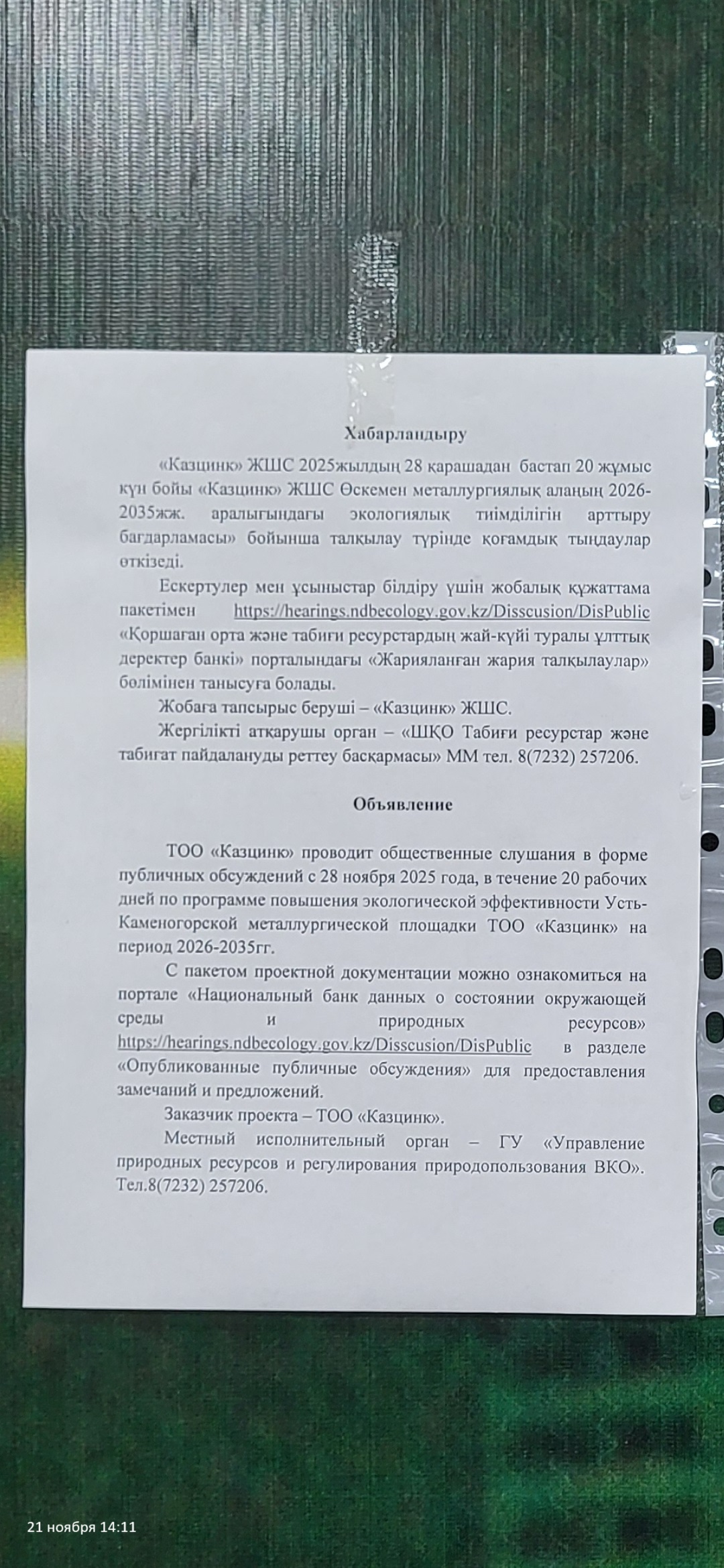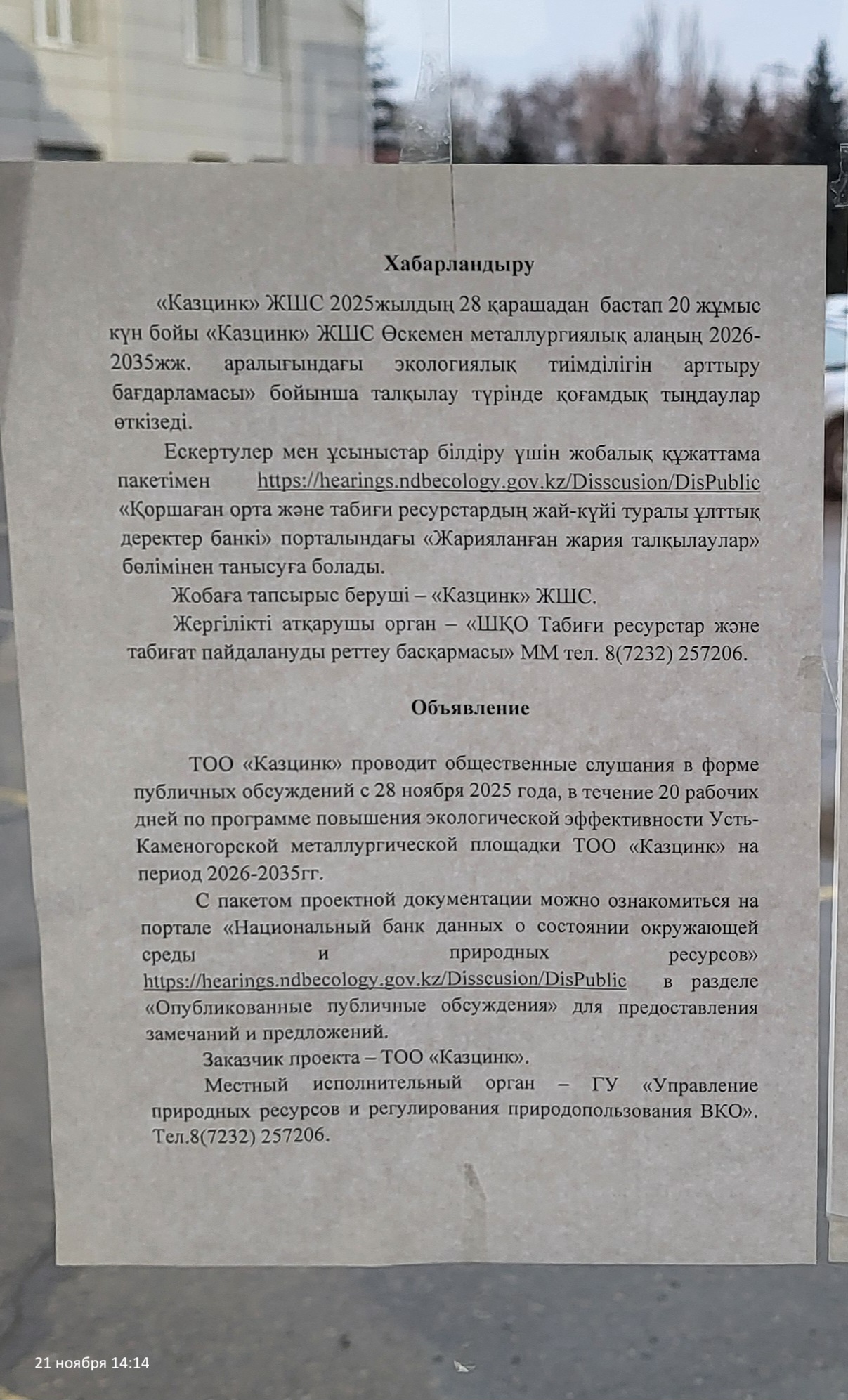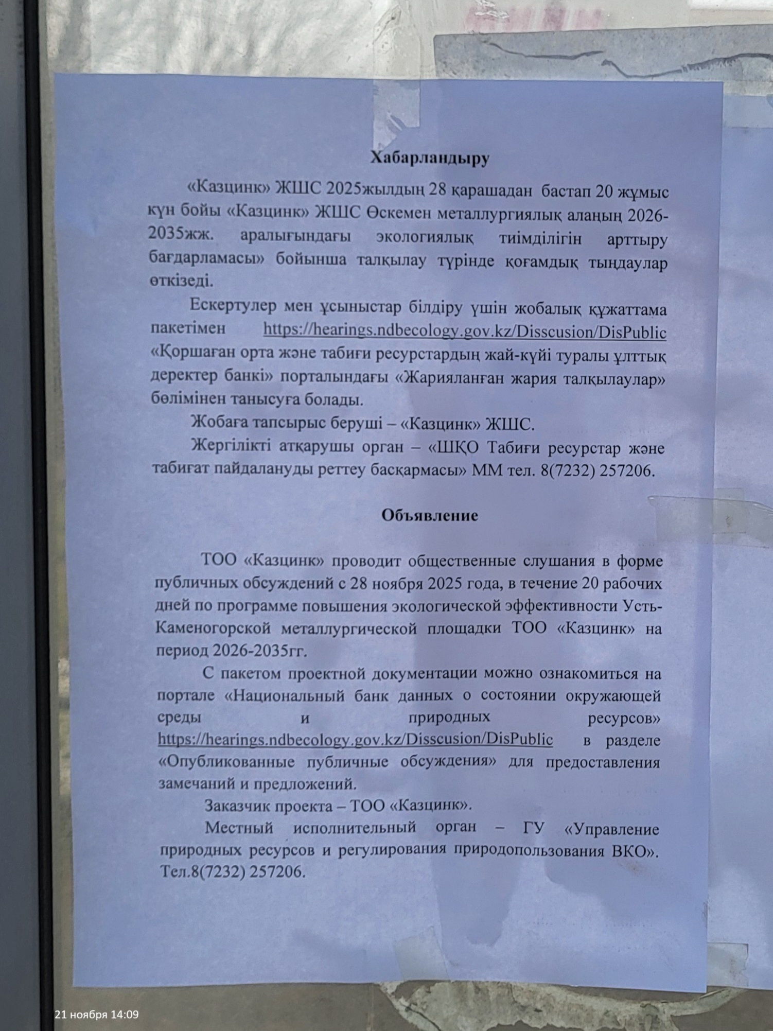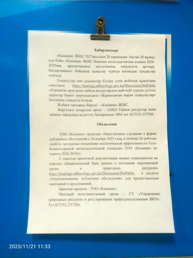 По проекту: Программа повышения экологической эффективности на период 2026-2035 годы ТОО "Казцинк" Усть-Каменогорская металлургическая площадка Металлургического комплекса