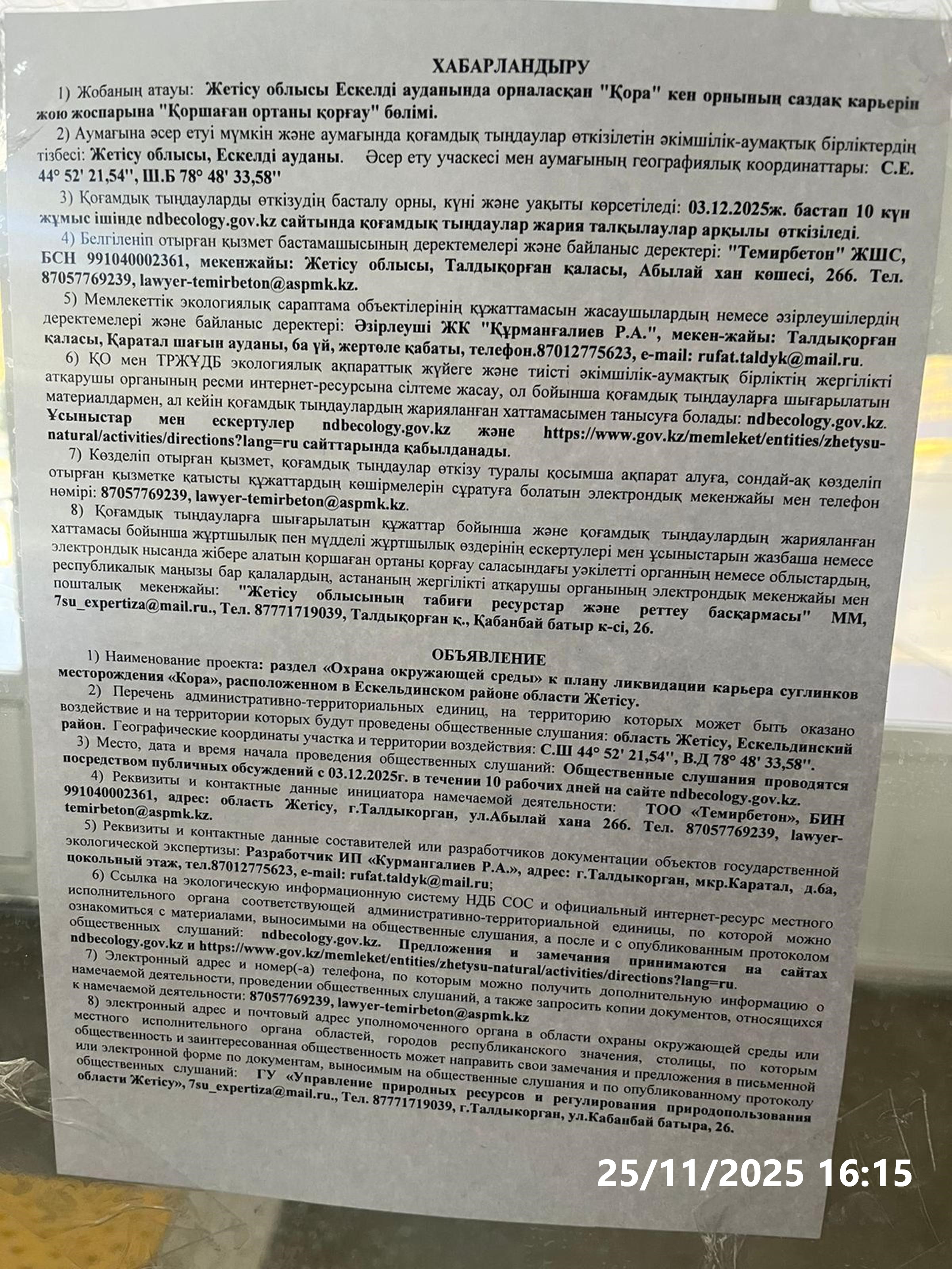 По проекту: План ликвидации карьера суглинков месторождения «Кора», расположенном в Ескельдинском районе области Жетісу