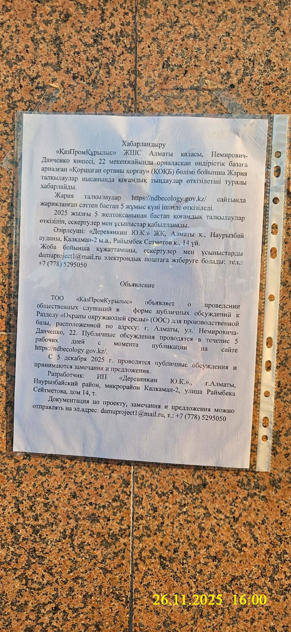 По проекту: Раздел «ОХРАНЫ ОКРУЖАЮЩЕЙ СРЕДЫ» для Производственной базы ТОО «КазПромКурылыс» расположенный по адресу: Республика Казахстан, г. Алматы, ул. Немировича-Данченко, 22