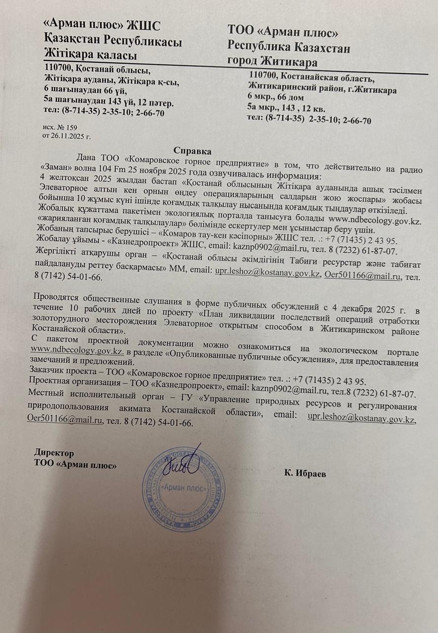 1. Инициатор: ""Комаровское тау-кен кәсіпорны"" жауапкершілігі шектеулі серіктестігі