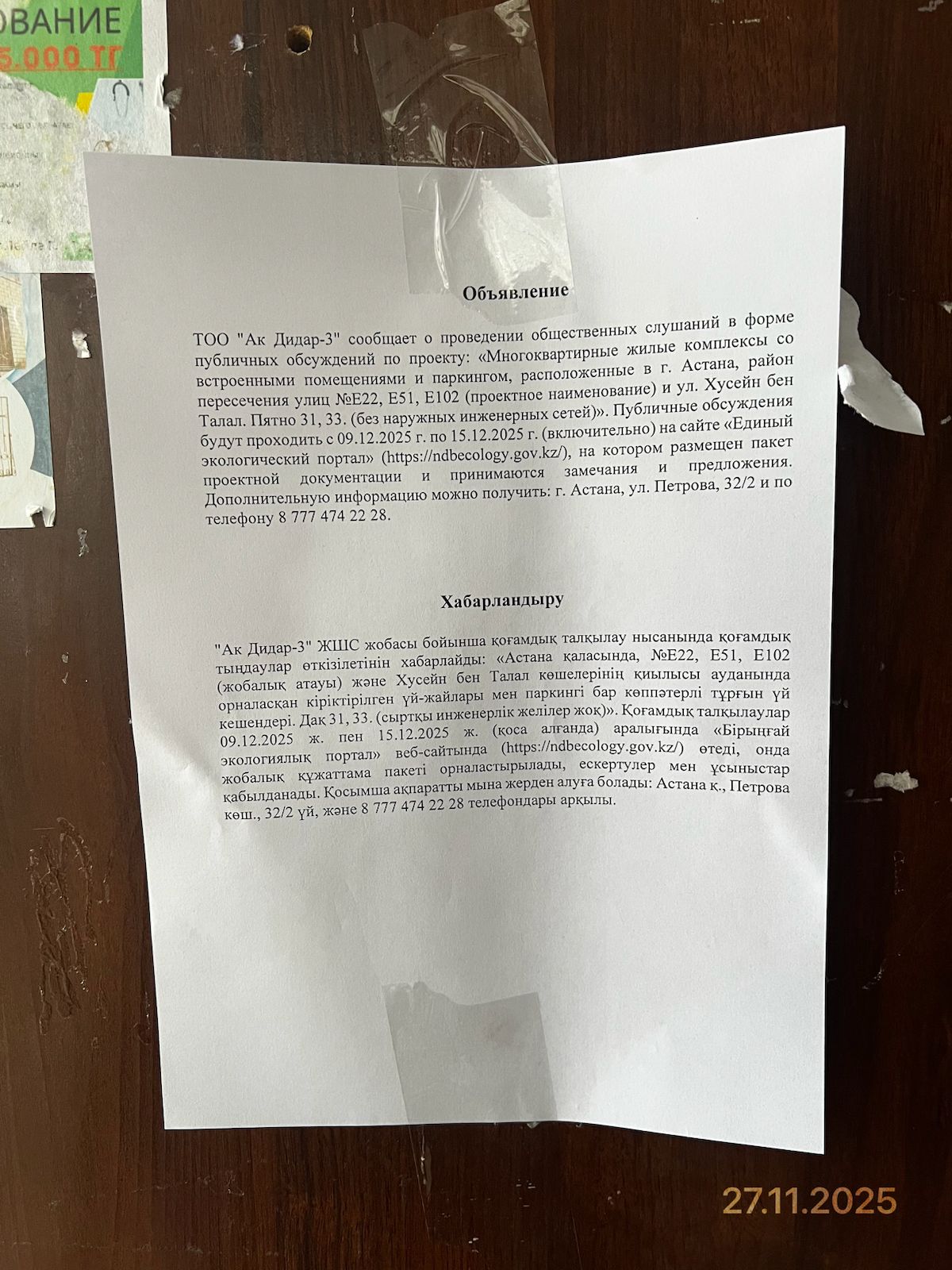 столицы, в адрес которого направлены материалы, выносимые на общественные слушания: