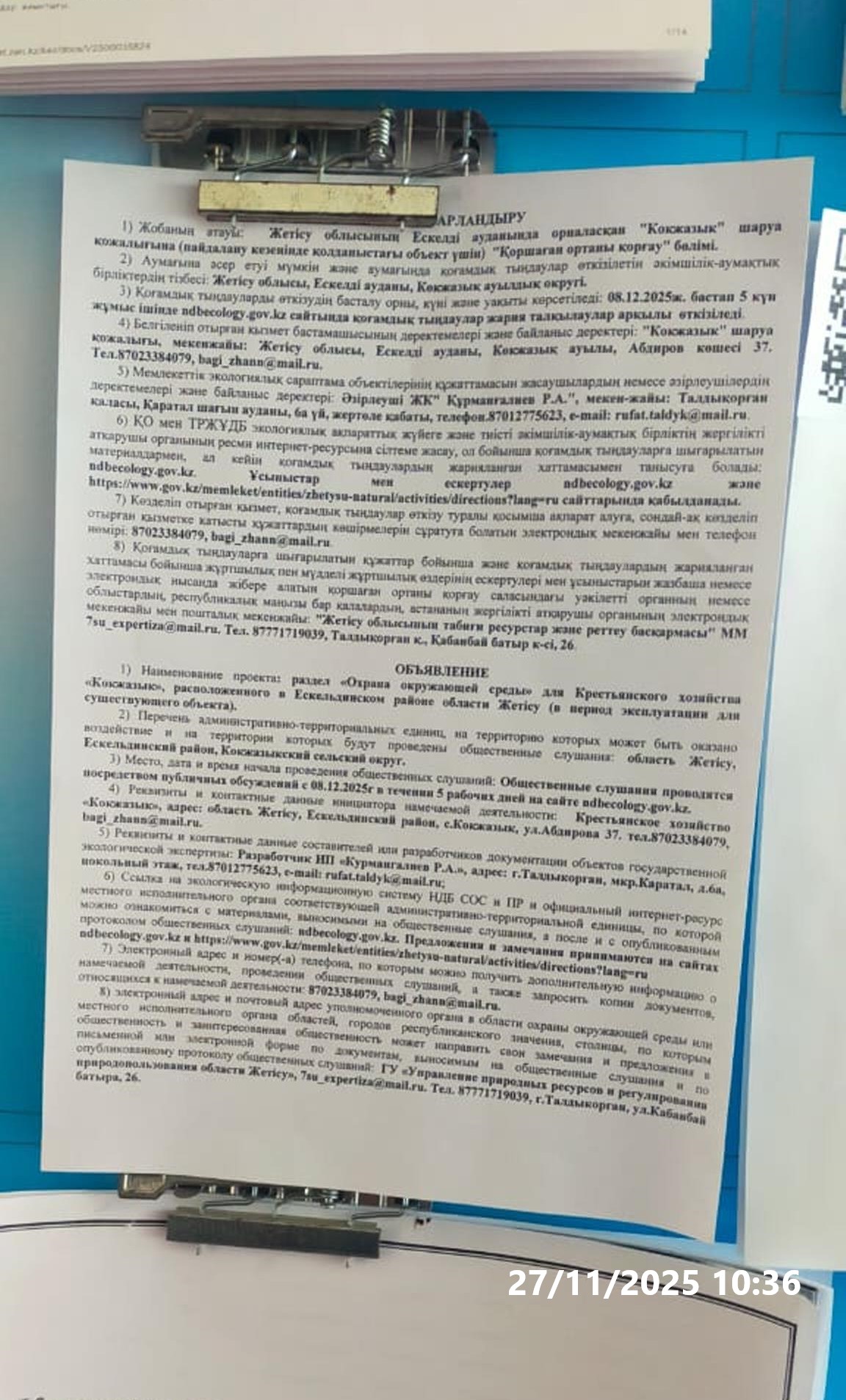 По проекту: Крестьянское хозяйство «Кокжазык», расположенного в Ескельдинском районе области Жетісу