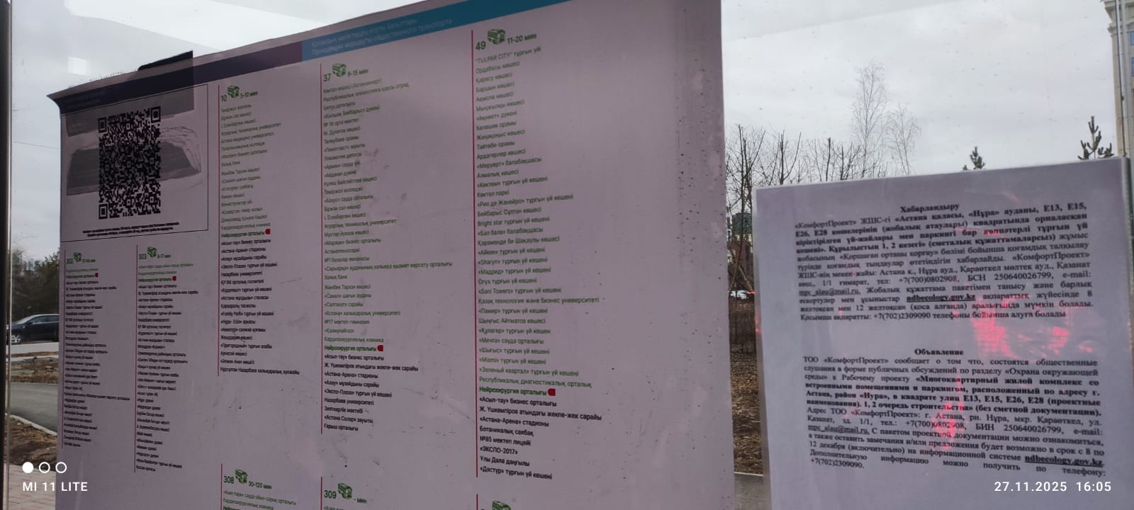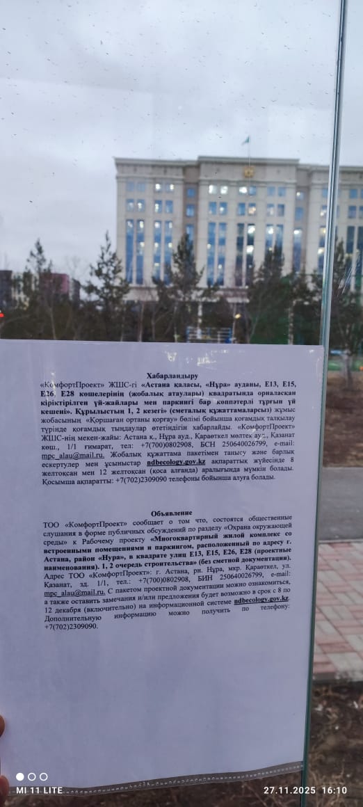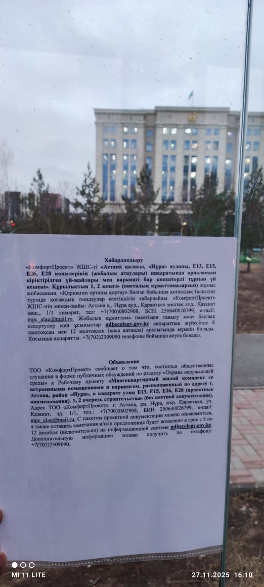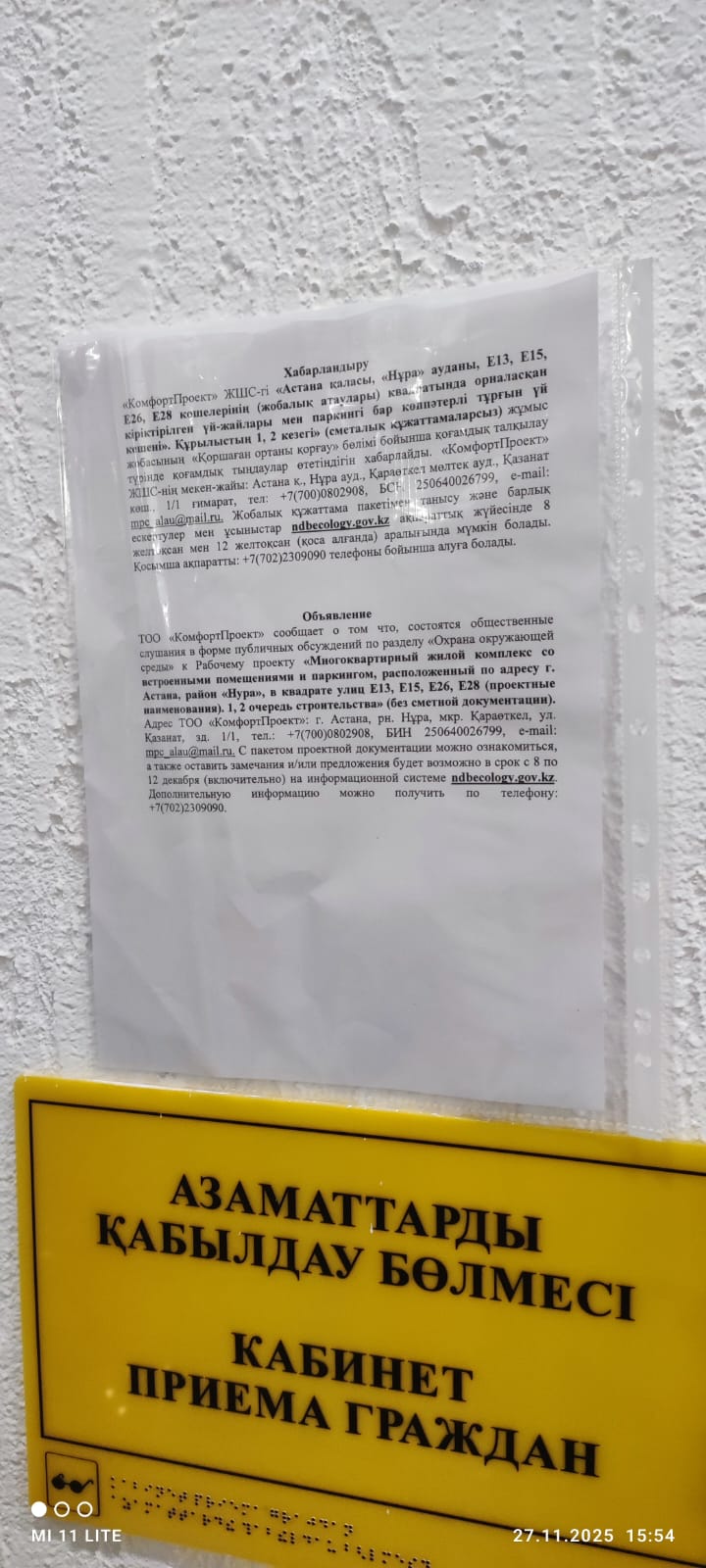 По проекту: Проект РООС к рабочему проекту «Многоквартирный жилой комплекс со встроенными помещениями и паркингом, расположенный по адресу г. Астана, район "Нура" в квадрате улиц Е13, Е15, Е26, Е28 (проектные наименования). 1, 2 очередь строительства» (без сметной документации)»/