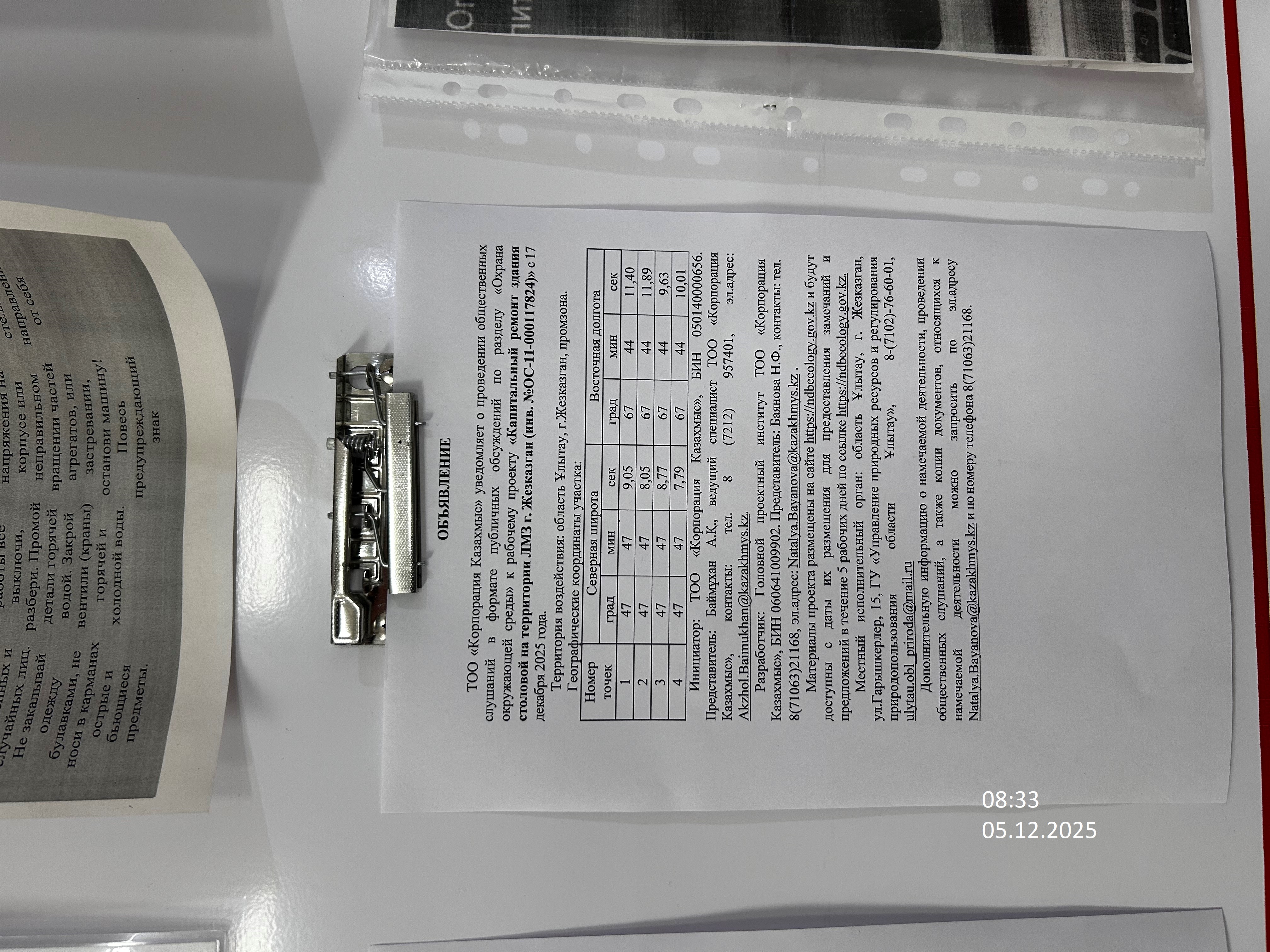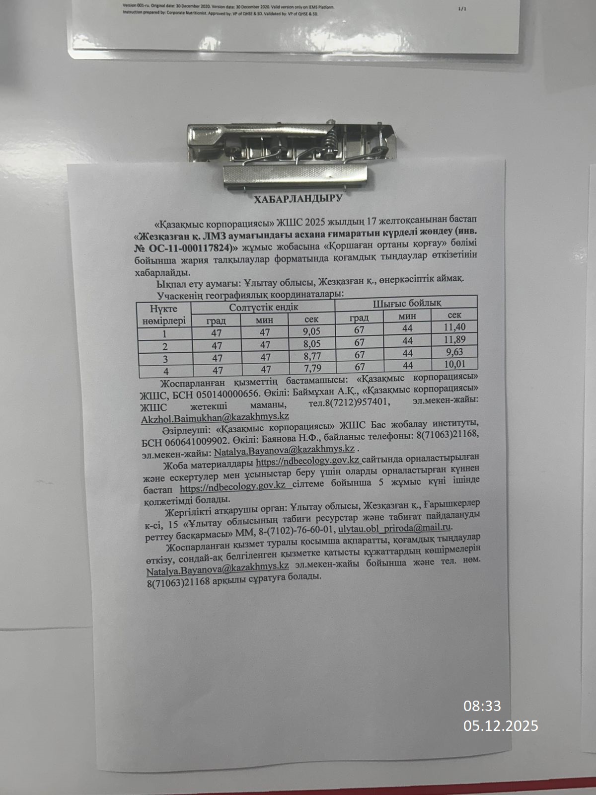 1.3. Контакты:akzhol.baimukhan@kazakhmys.kz; ;