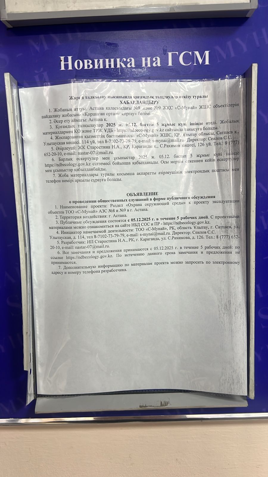 По проекту: Проект эксплуатации объектов ТОО «С-Мунай» АЗС №8 и №9 в г. Астана с разделом Охрана окружающей среды