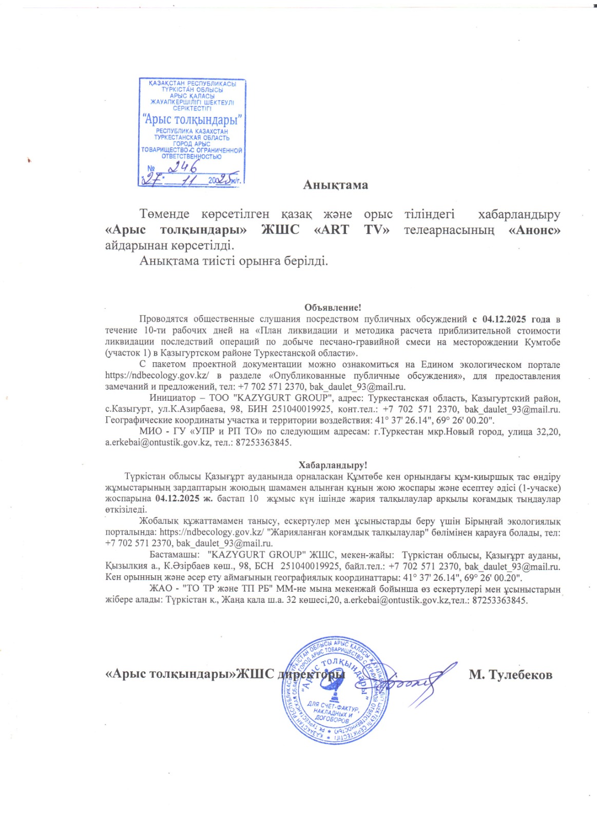 По проекту: План ликвидации и методика расчета приблизительной стоимости ликвидации последствий операций по добыче песчано-гравийной смеси на месторождении Кумтобе (участок 1) в Казыгуртском районе Туркестанской области