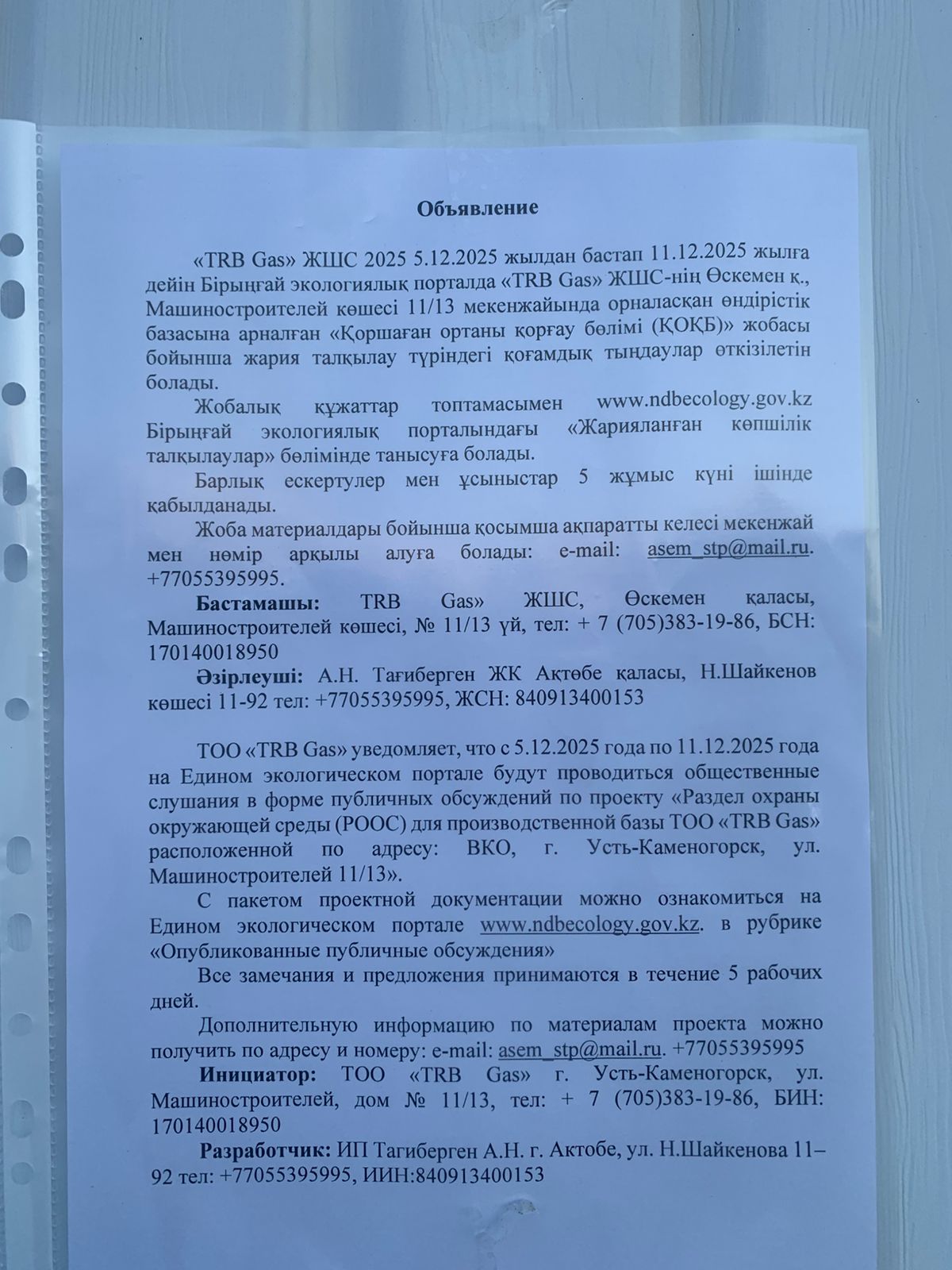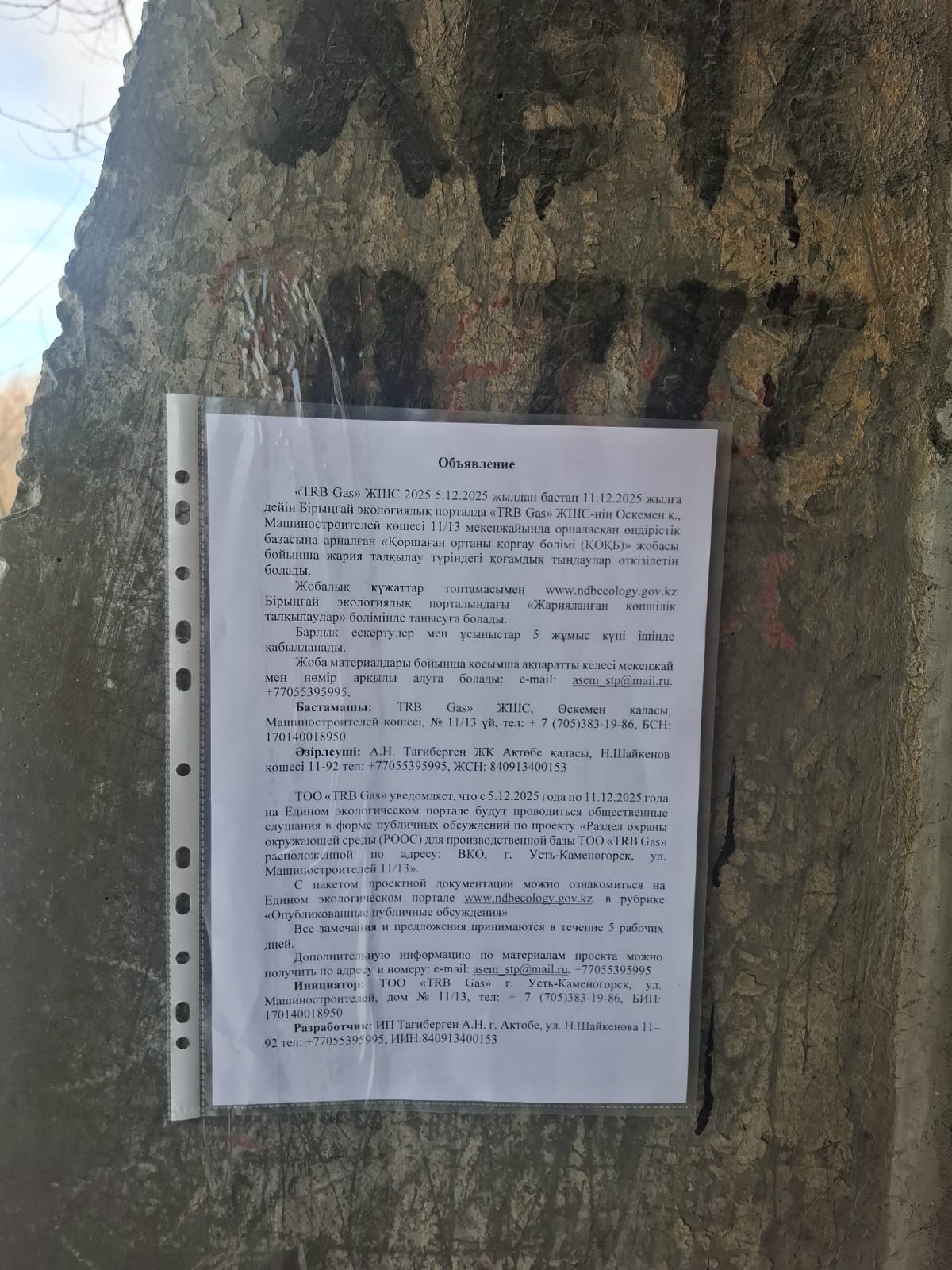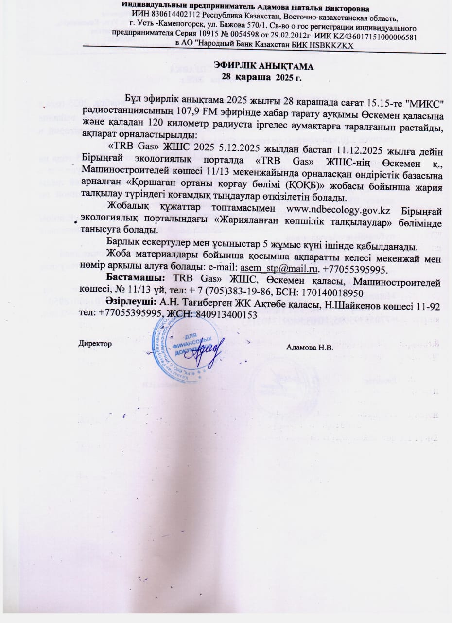 По проекту: Раздел охраны окружающей среды (РООС) для производственной базы ТОО «TRB Gas» расположенной по адресу: ВКО, г. Усть-Каменогорск, ул. Машиностроителей 11/13.