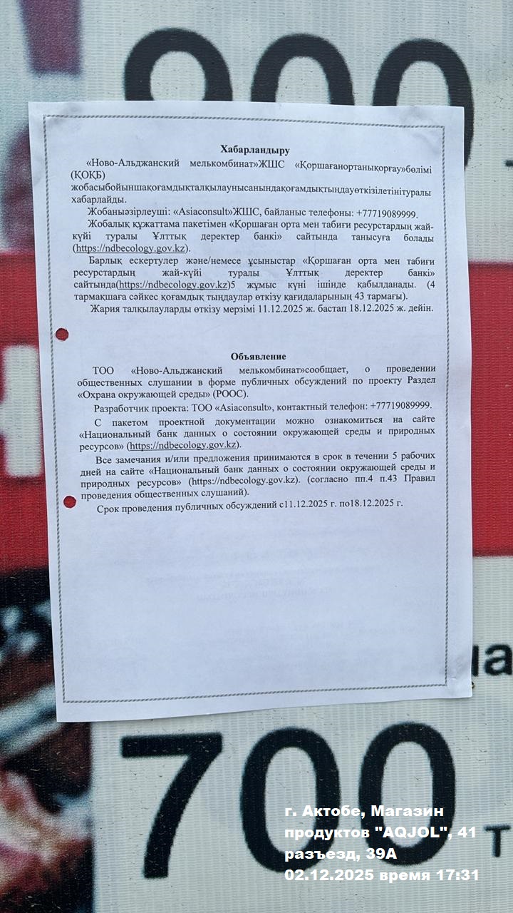 По проекту: ТОО «Ново-Альджанский мелькомбинат» Раздел «Охрана окружающей среды» (РООС)
