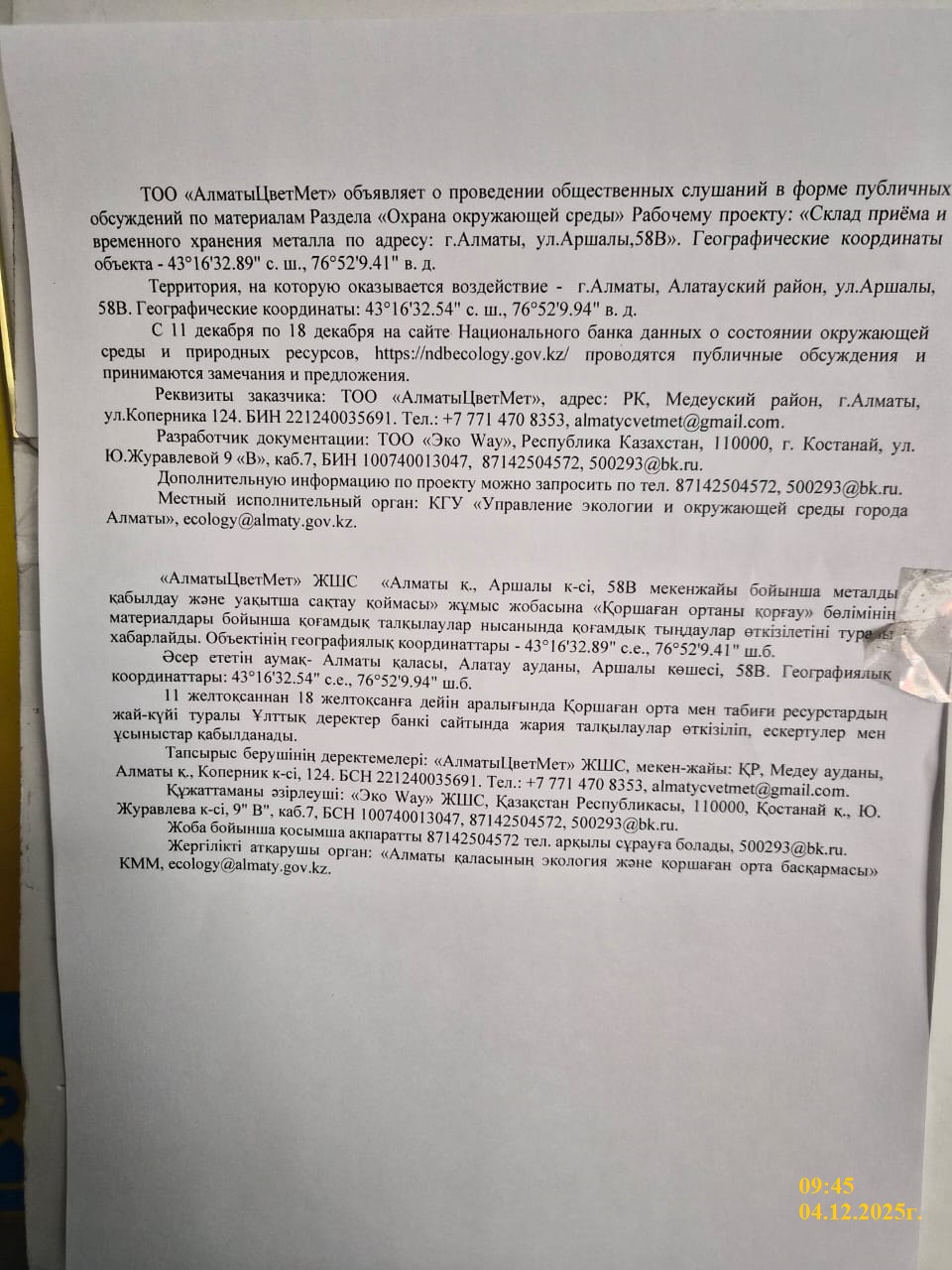 Неправительственная организация НПО ОО «Граждане Алматы», в ходе анализа проектной документации, представленной на общественные слушания по проекту «Склад приёма и временного хранения металла по адресу: г. Алматы, ул. Аршалы, 58В», установила ряд несоответствий и неполноту сведений в части соблюдения требований водоохранного законодательства Республики Казахстан, что требует дополнительной правовой и экологической оценки.