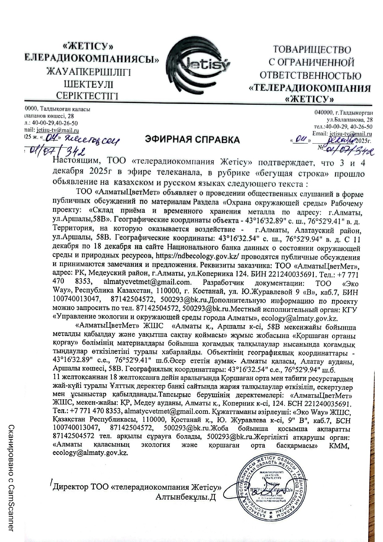 В ходе самостоятельно проведённого общественного мониторинга и анализа информации, размещённой в открытых источниках, НПО ОО «Граждане Алматы» установило, что объект ТОО «АлматыЦветМет» расположен на земельном участке с кадастровым номером 20-321-015-021, который находится в границах водоохранной зоны реки Ащыбулак и относится к территории с установленными особыми условиями землепользования и ограничениями хозяйственной деятельности.