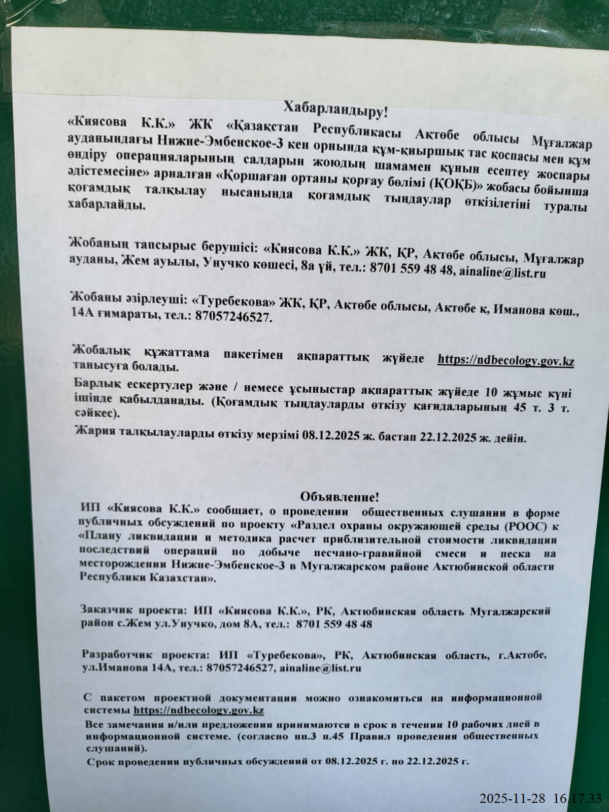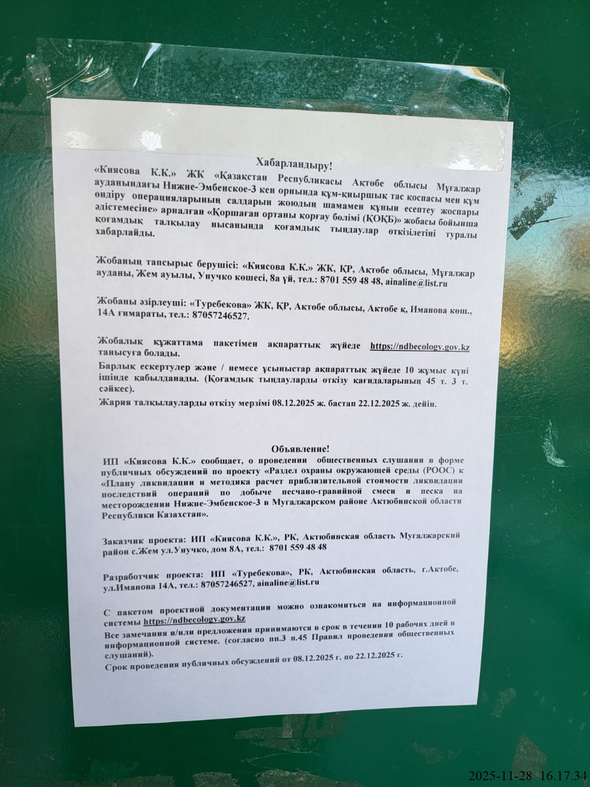 По проекту: План ликвидации и методика расчет приблизительной стоимости ликвидации последствий операций по добыче песчано-гравийной смеси и песка на месторождении Нижне-Эмбенское-3 в Мугалжарском районе Актюбинской области Республики Казахстан» c проектом «Раздел охраны окружающей среды (РООС)