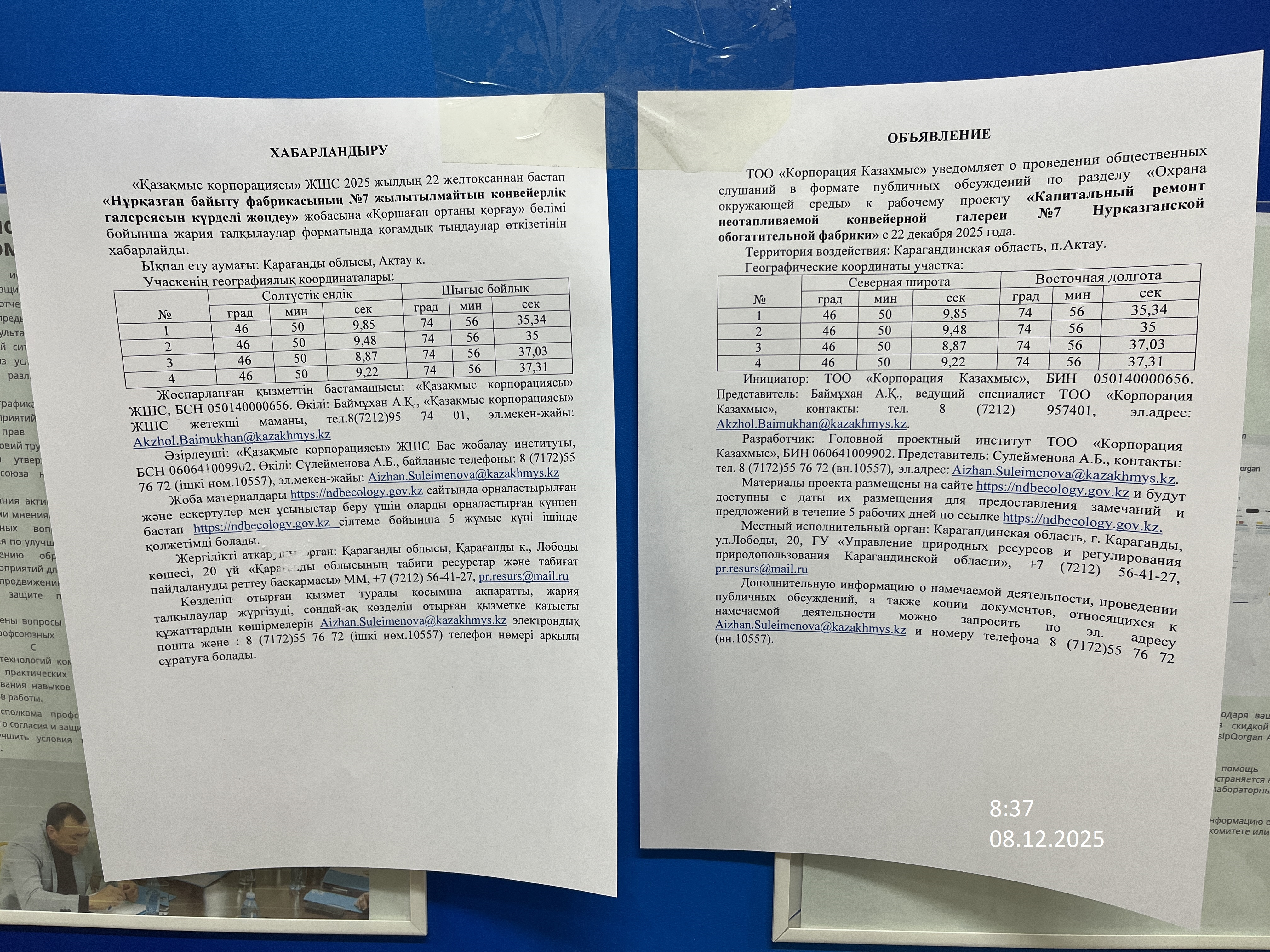1.3. Контакты:akzhol.baimukhan@kazakhmys.kz; ;
