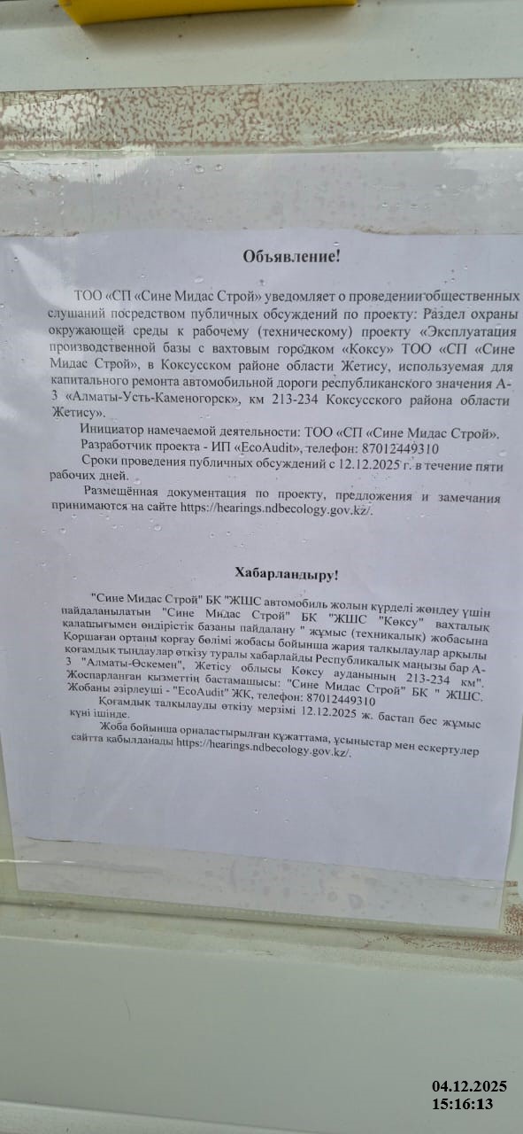 По проекту: РАЗДЕЛ ОХРАНЫ ОКРУЖАЮЩЕЙ СРЕДЫ к рабочему (техническому) проекту «Эксплуатация производственной базы с вахтовым городком «Коксу» ТОО «СП «Сине Мидас Строй», в Коксусском районе области Жетису, используемая для капитального ремонта автомобильной дороги республиканского значения А-3 «Алматы-Усть-Каменогорск», км 213-234 Коксусского района области Жетису»