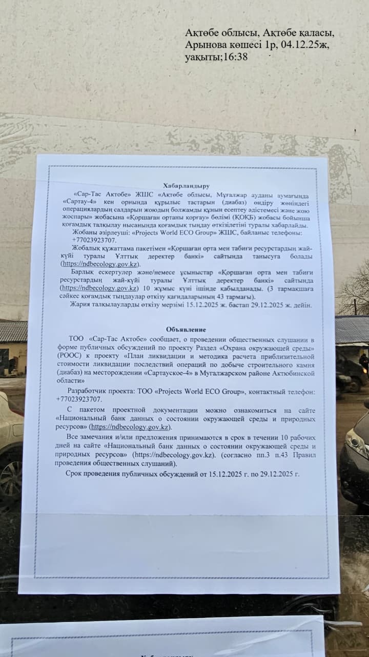 По проекту: Раздел «Охрана окружающей среды» (РООС) к «Плану ликвидации и методике расчета приблизительной стоимости ликвидации последствий операций по добыче строительного камня (диабаз) на месторождении Сартауское-4 в Мугалжарском районе Актюбинской области
