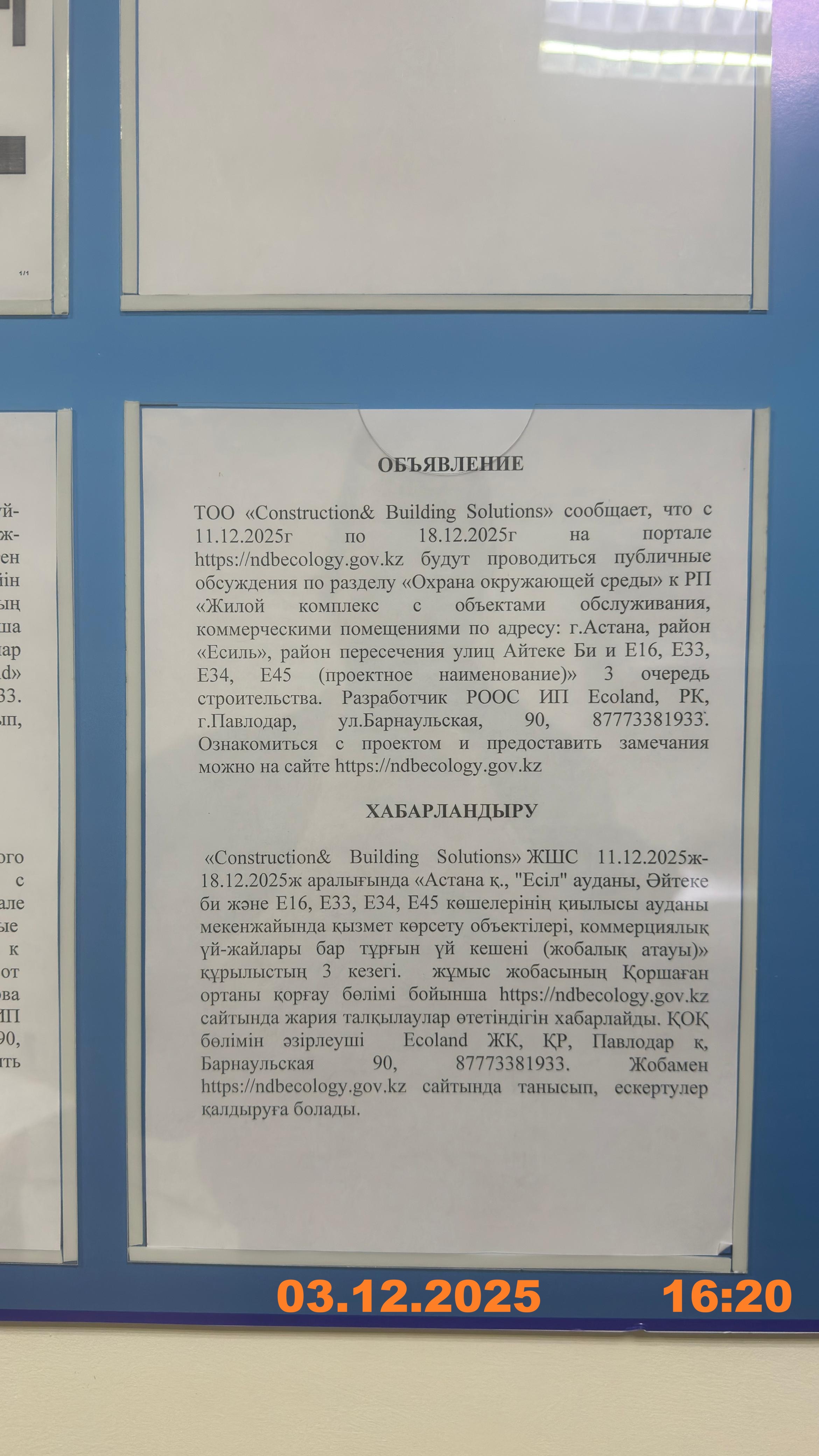 По проекту: РАЗДЕЛ ОХРАНА ОКРУЖАЮЩЕЙ СРЕДЫ к рабочему проекту "Жилой комплекс с объектами обслуживания, коммерческими помещениями по адресу г. Астана, район "Есиль",район пересечения улиц Айтеке би и Е16, Е33, Е34, Е45 (проектное наименование)" 3 очередь строительства