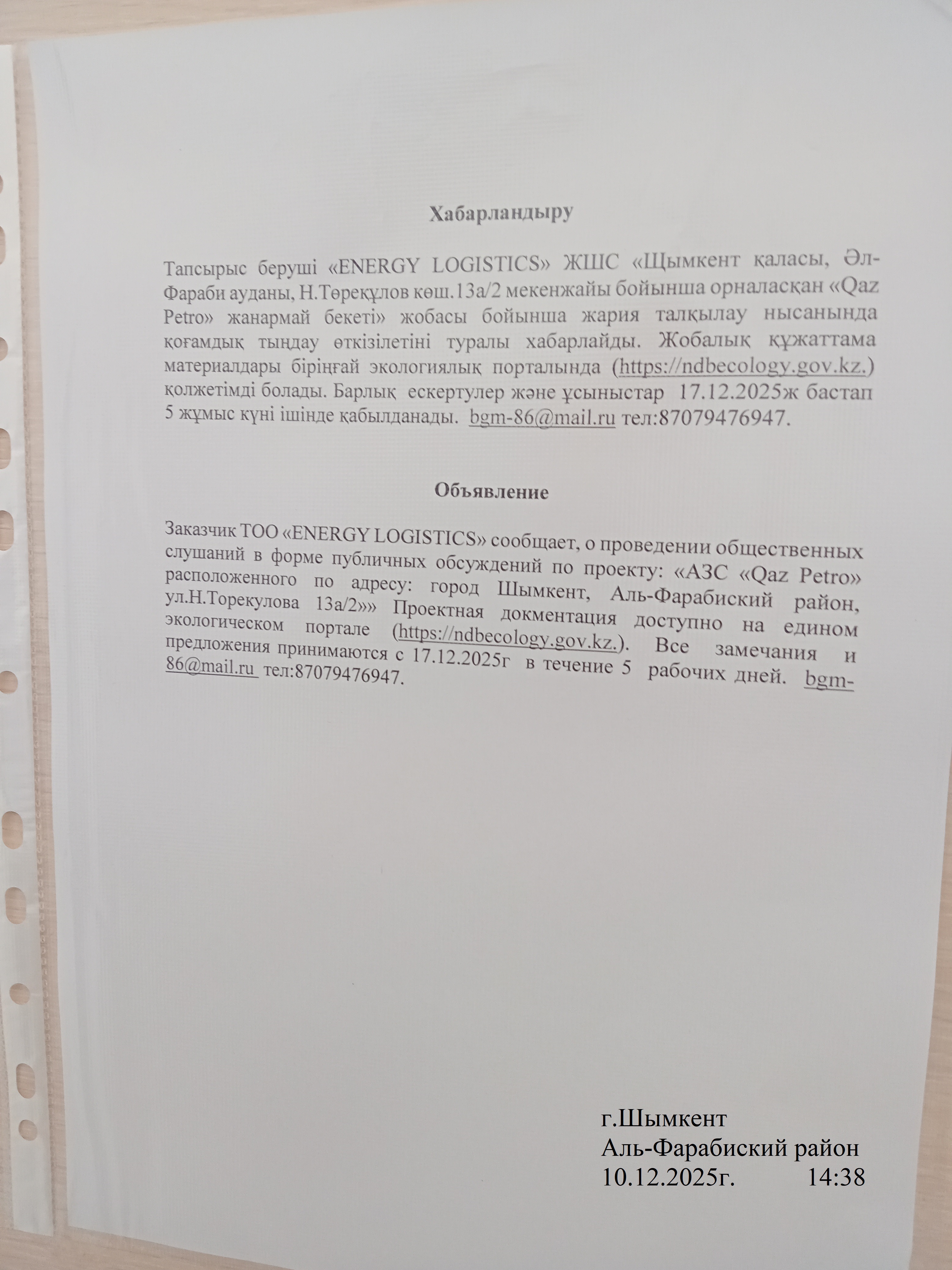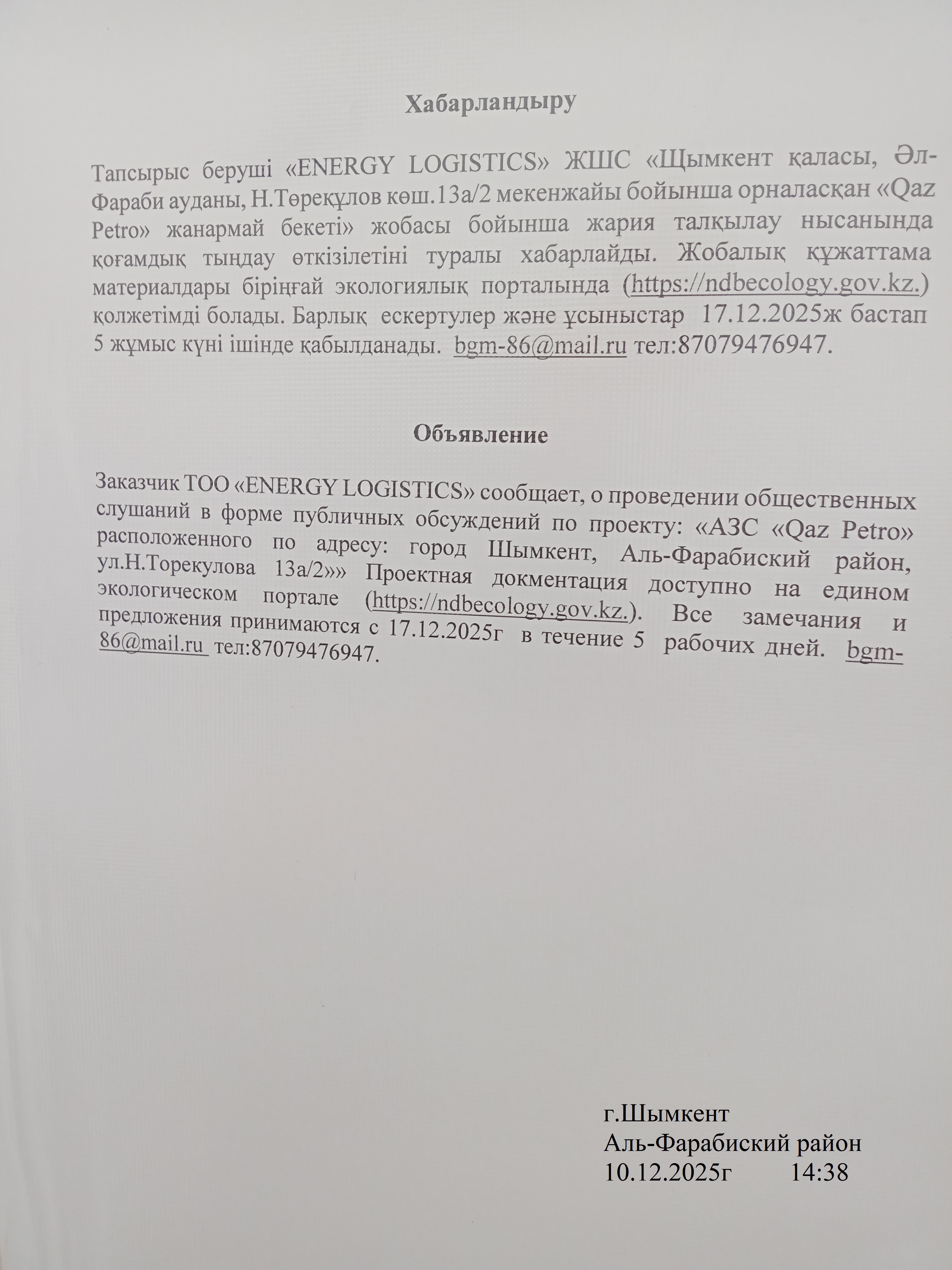 По проекту: «АЗС «Qaz Petro» расположенного по адресу: город Шымкент, Аль-Фарабиский район, ул.Н.Торекулова 13а/2»»
