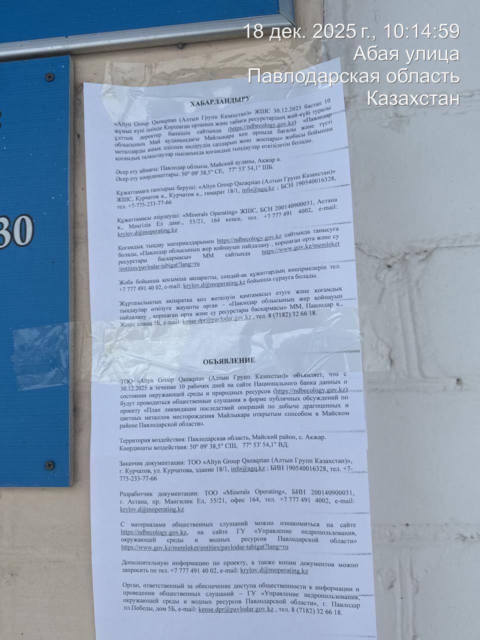 По проекту: План ликвидации последствий операций по добыче драгоценных ицветных металлов месторождения Майлыкара открытым способом в Майском районе Павлодарской области.
