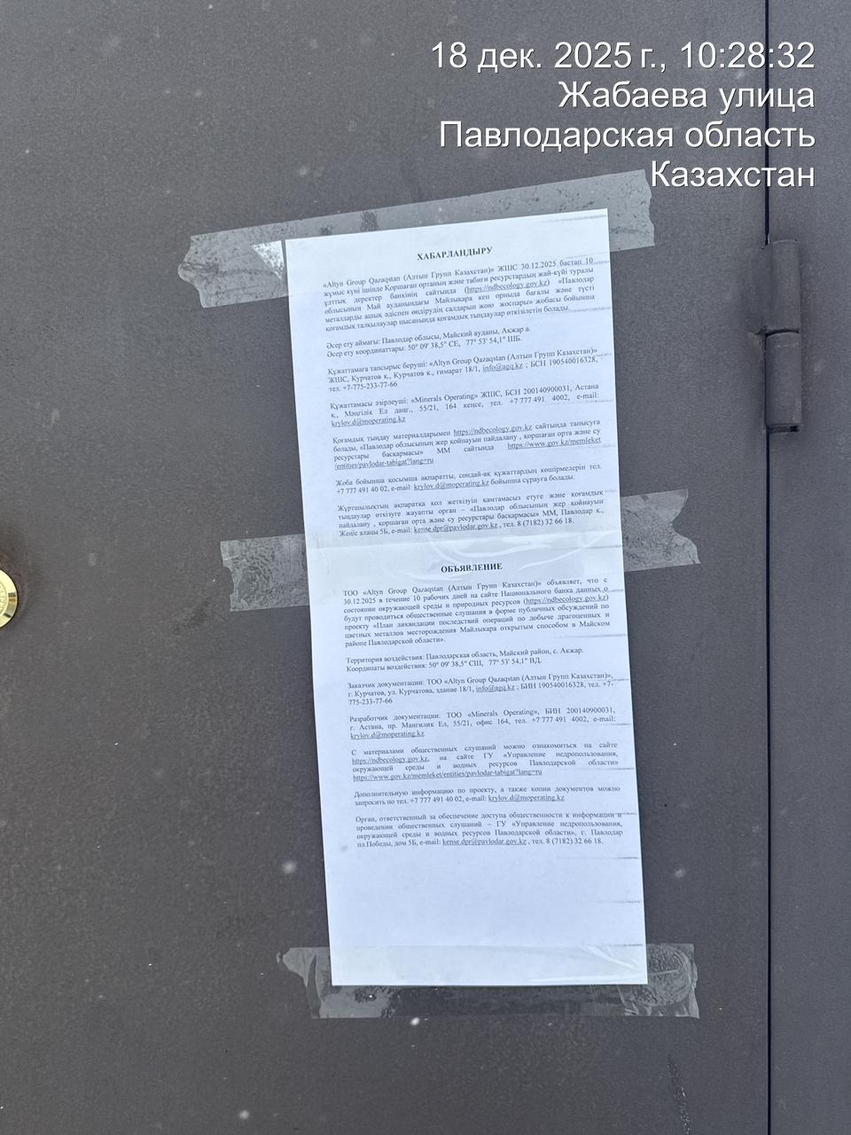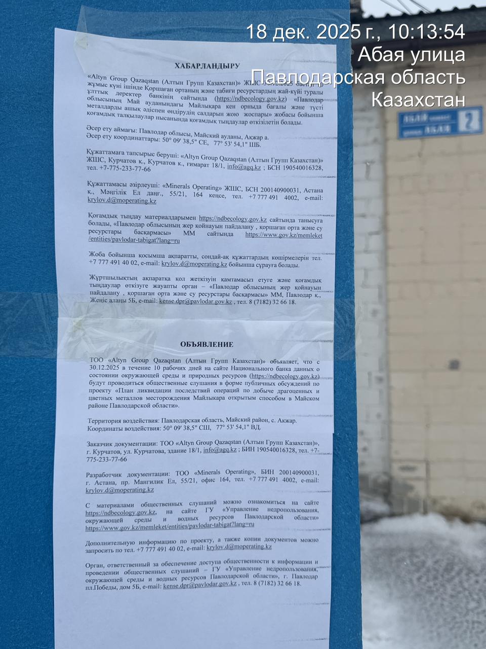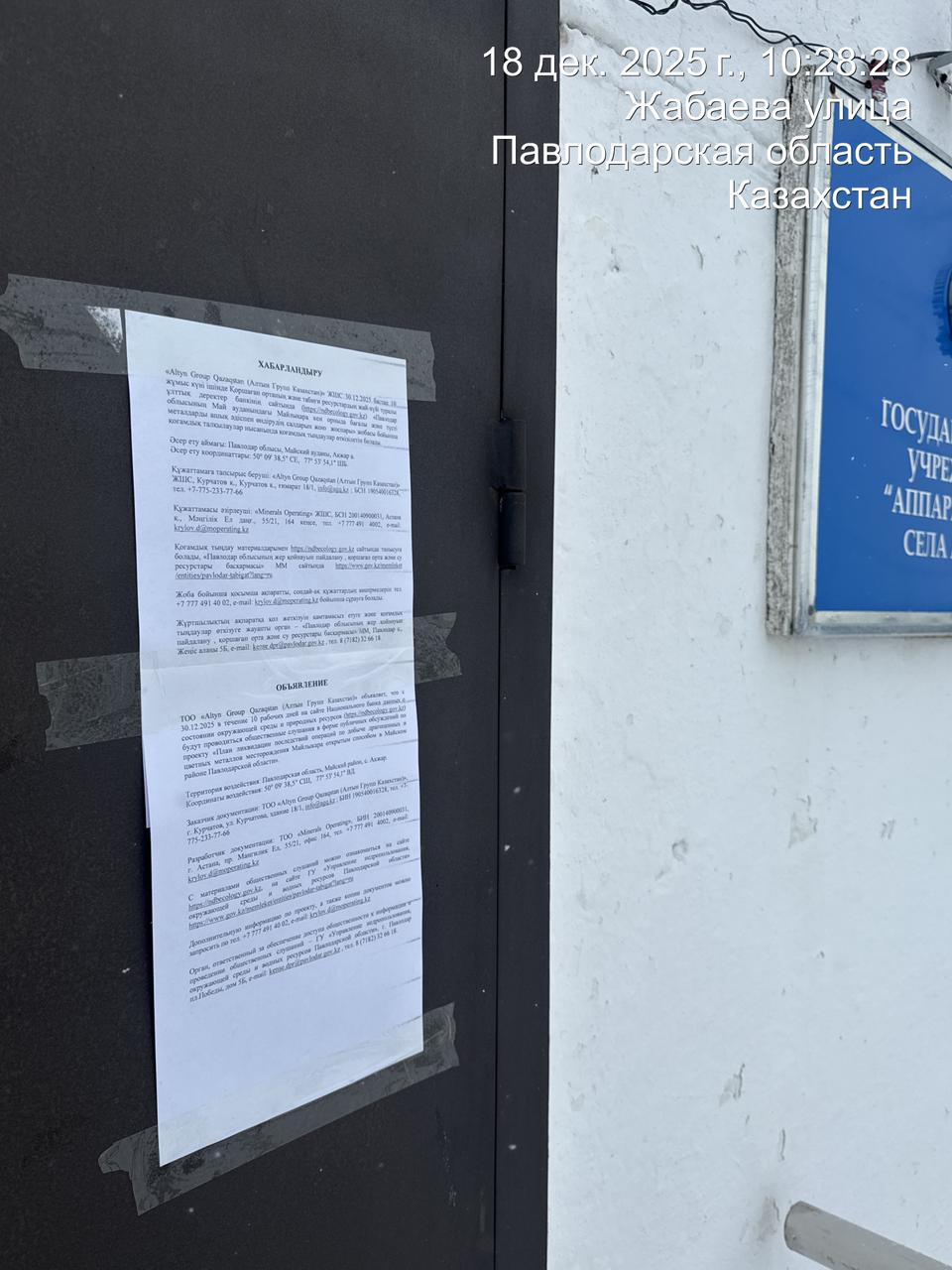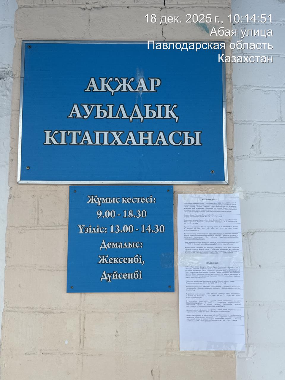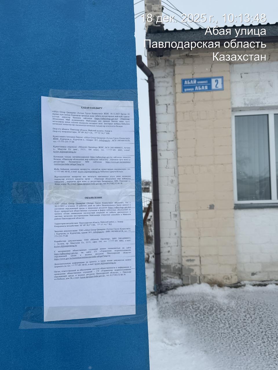 | 1 | Павлодарская область, Майский район, Акжарский с.о. |