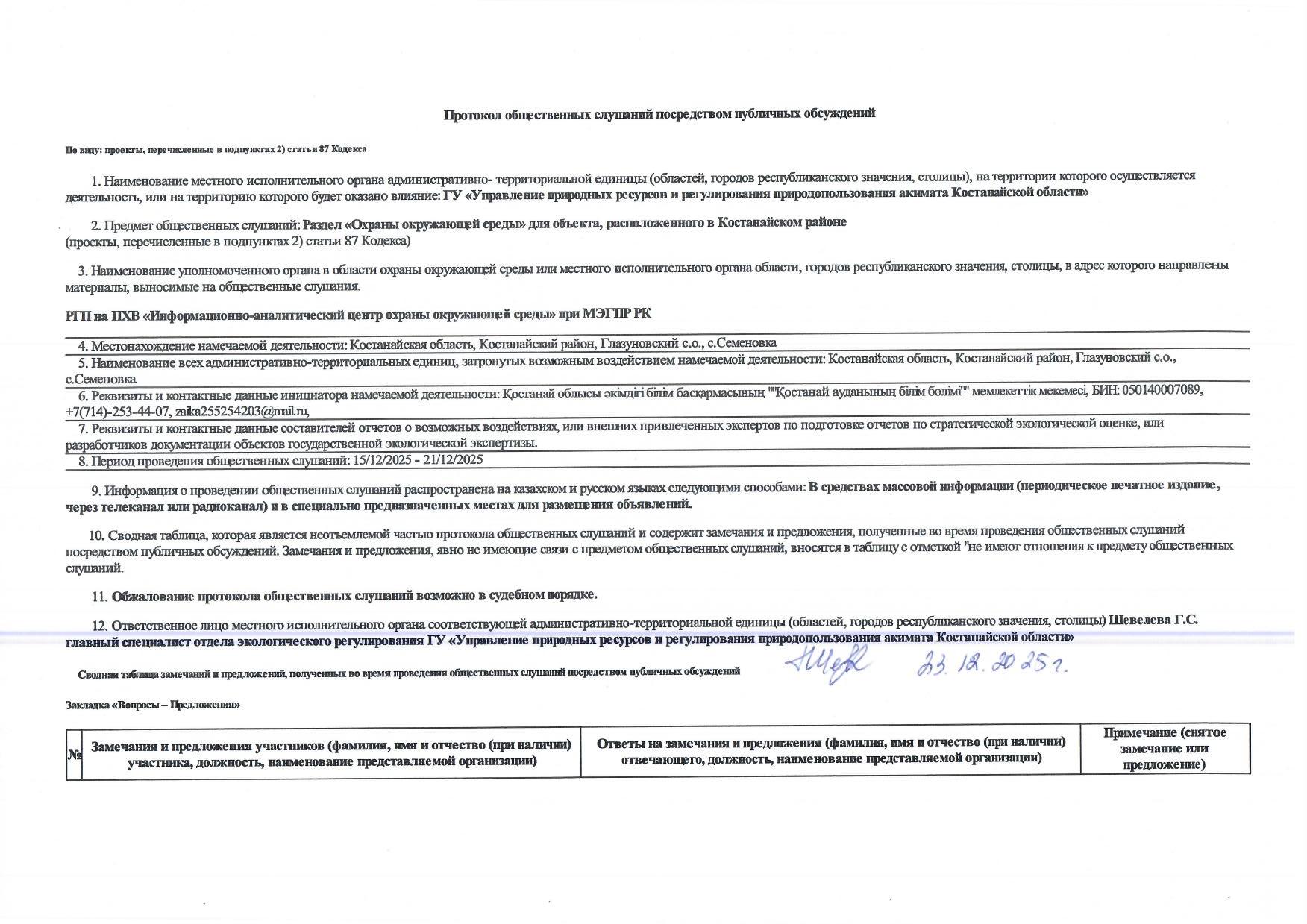 2. Период проведения общественных слушаний: 15.12.2025 - 19.12.2025