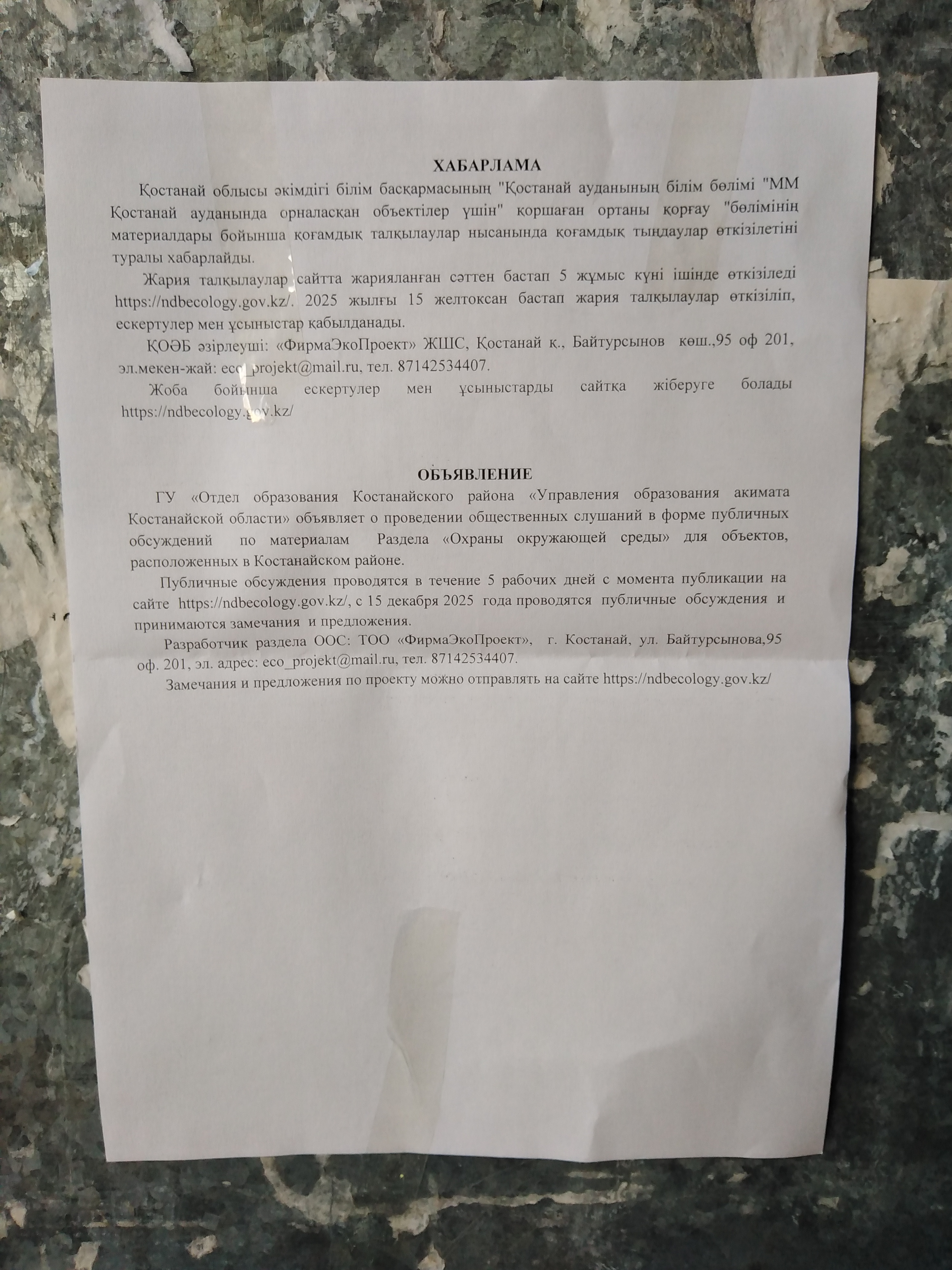 По проекту: Раздел «Охраны окружающей среды» для объектов, расположенных в Костанайском районе.