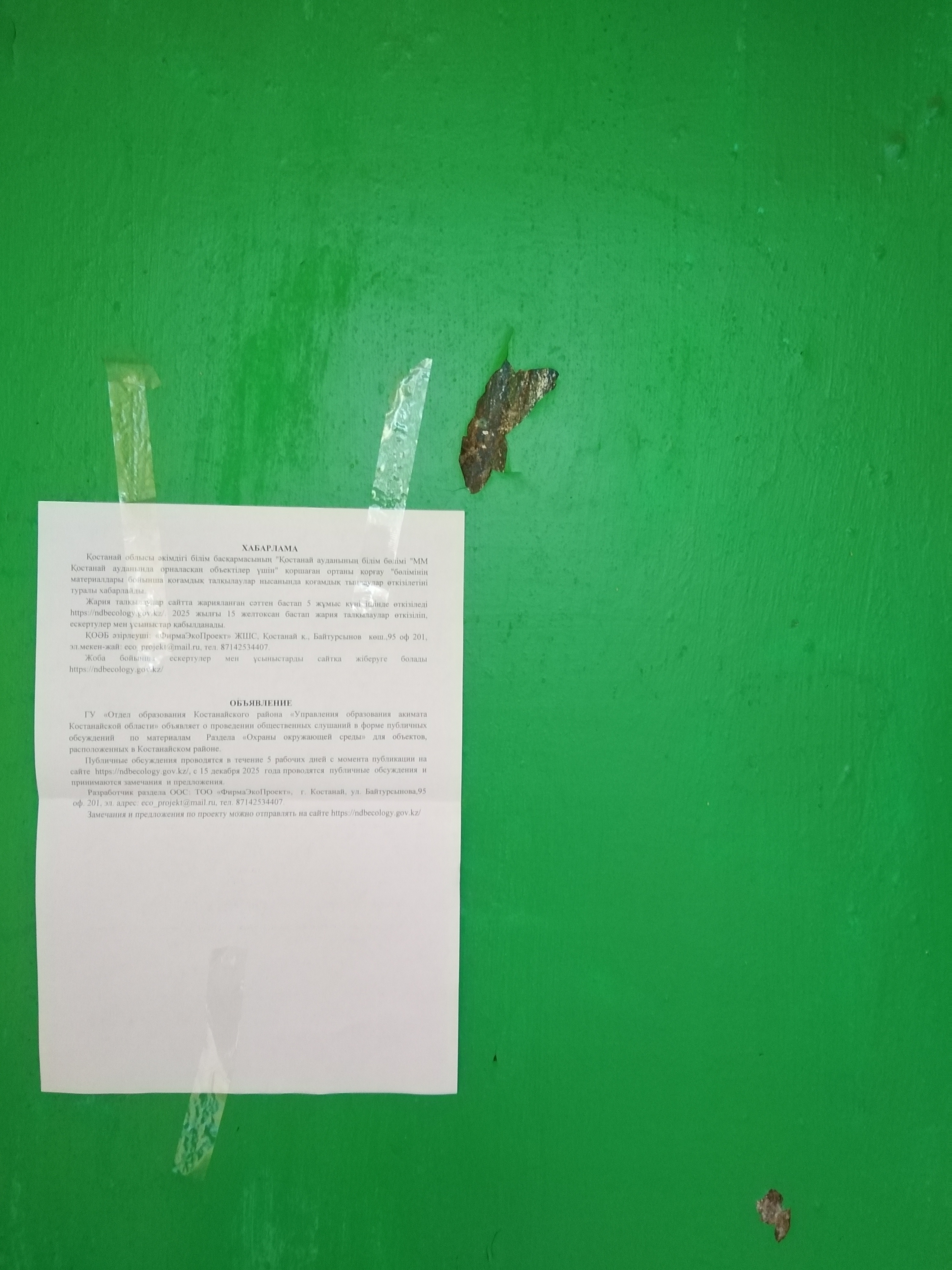 По проекту: Раздел «Охраны окружающей среды» для объектов, расположенных в Костанайском районе.