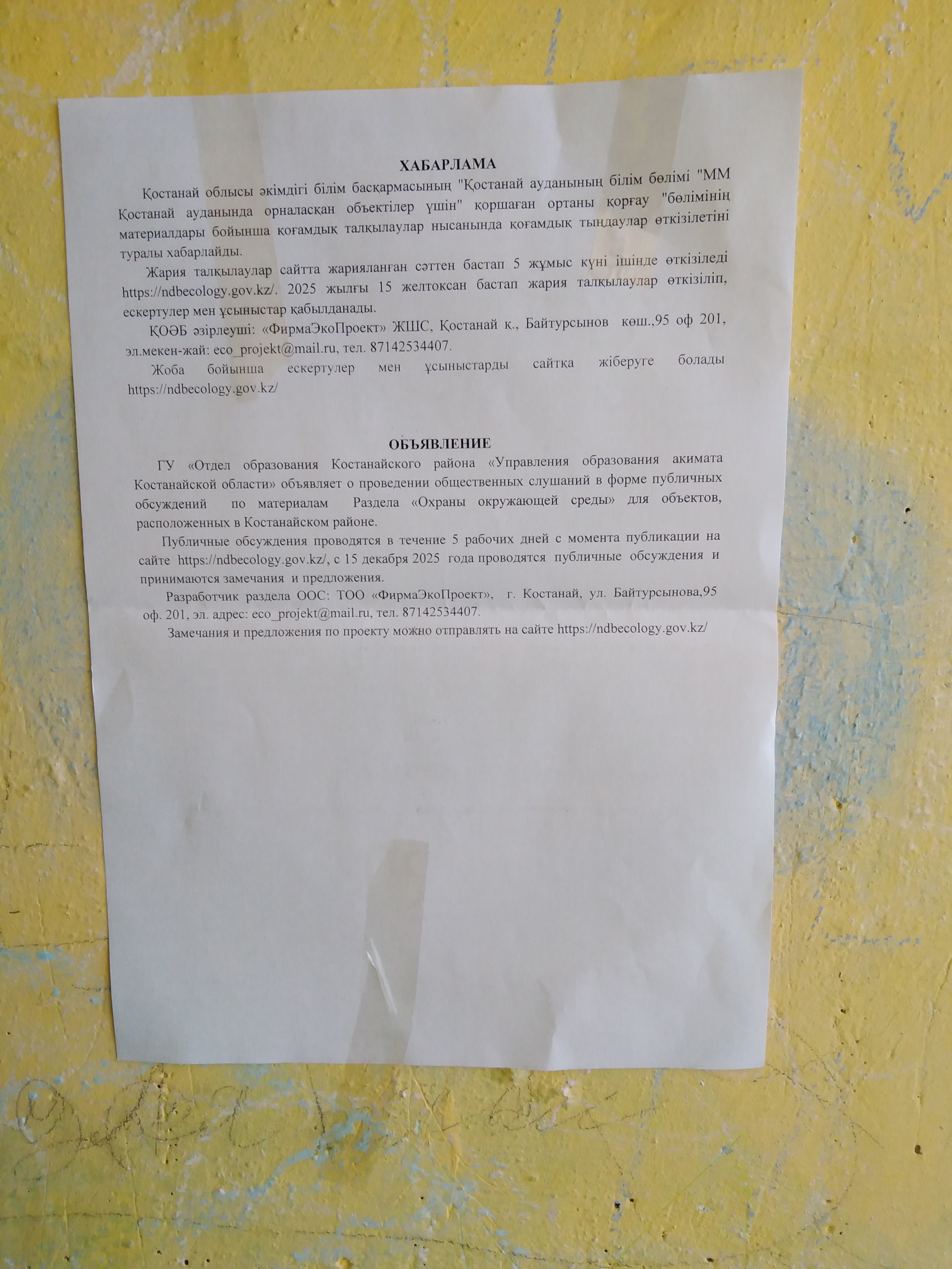 По проекту: Раздел «Охраны окружающей среды» для объектов, расположенных в Костанайском районе.
