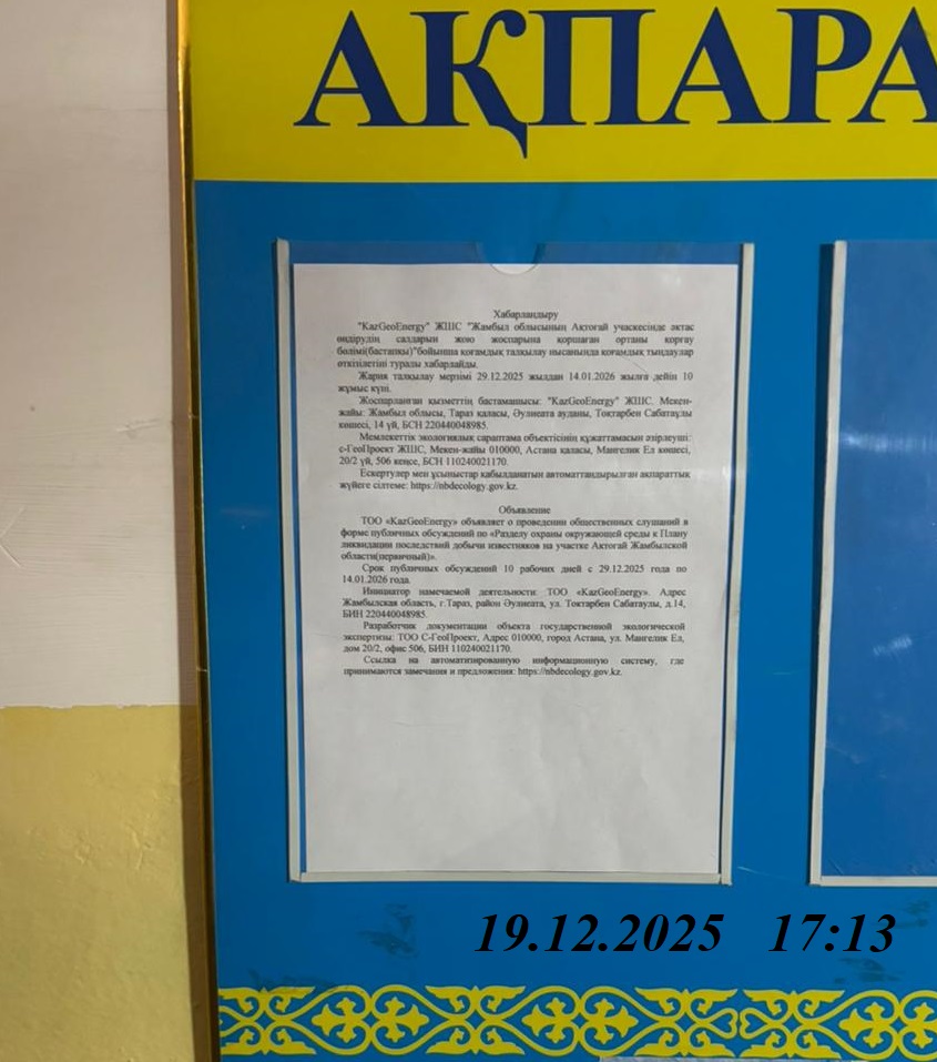 По проекту: ПЛАН ЛИКВИДАЦИИ последствий добычи известняков на участке Актогай Жамбылской области (первичный)