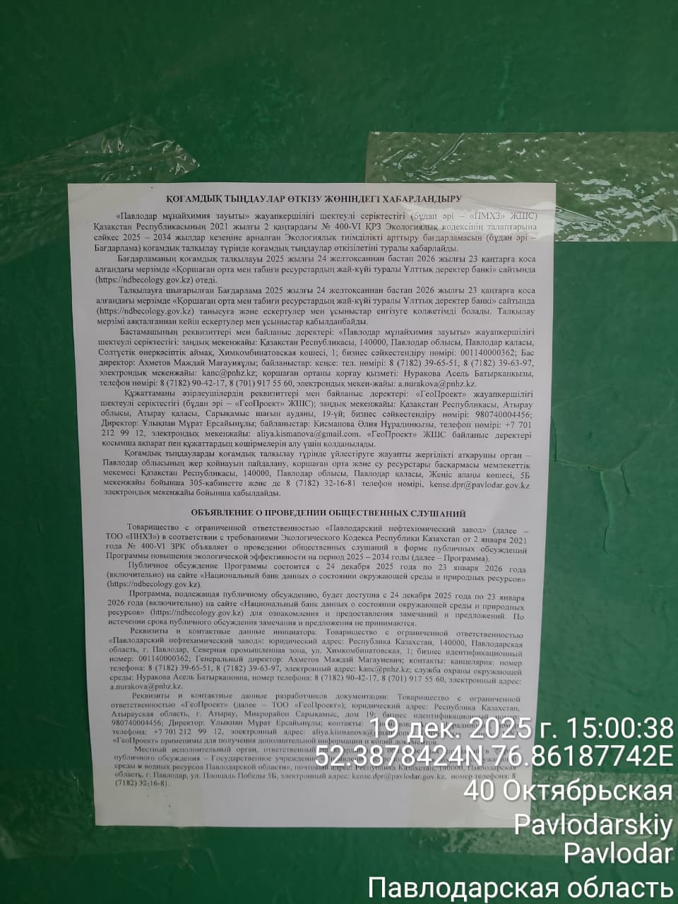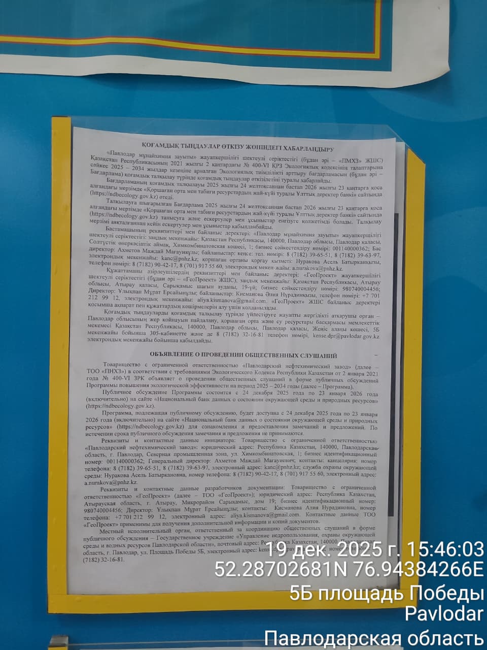 По проекту: Программа повышения экологической эффективности на период 2025 – 2034 годы ТОО "ПНХЗ"