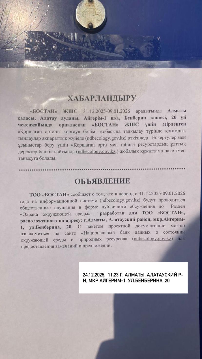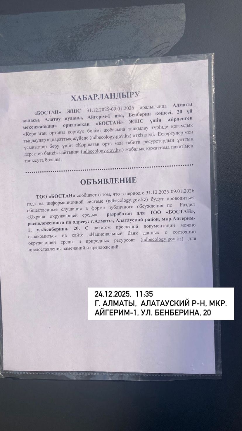 В настоящее время на платформе НБД СОС и ПР проходят общественные слушания по проекту «Охрана окружающей среды», разработанному для ТОО «БОСТАН», расположенного по адресу: г. Алматы, Алатауский район, мкр. Айгерим-1, ул. Бенберина, 20.