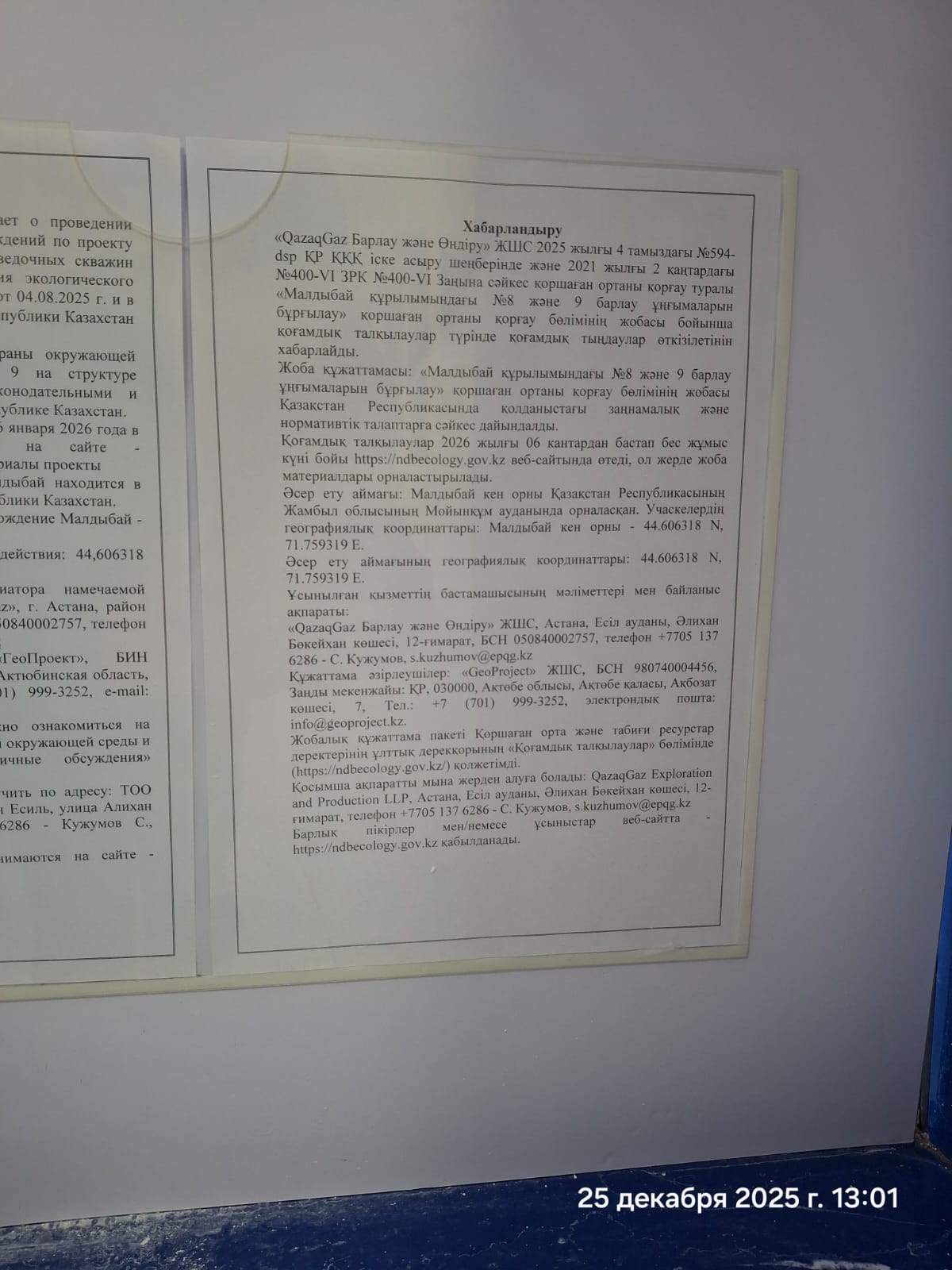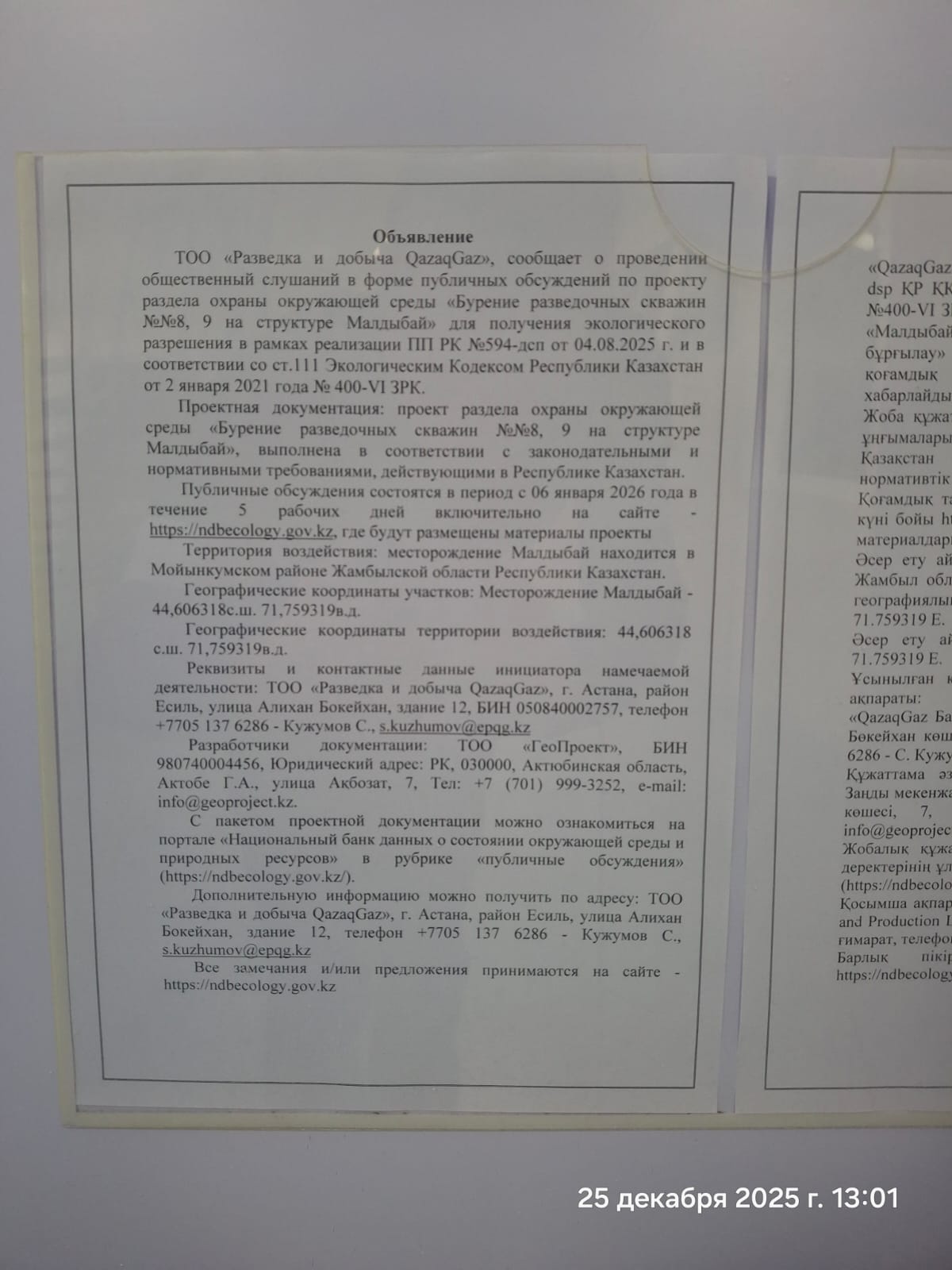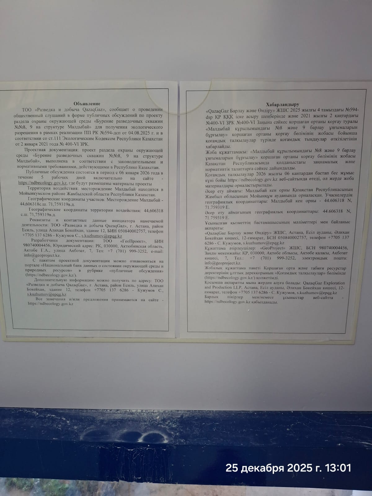 По проекту: Проект бурения разведочных скважин №8, №9 на структуре Малдыбай»