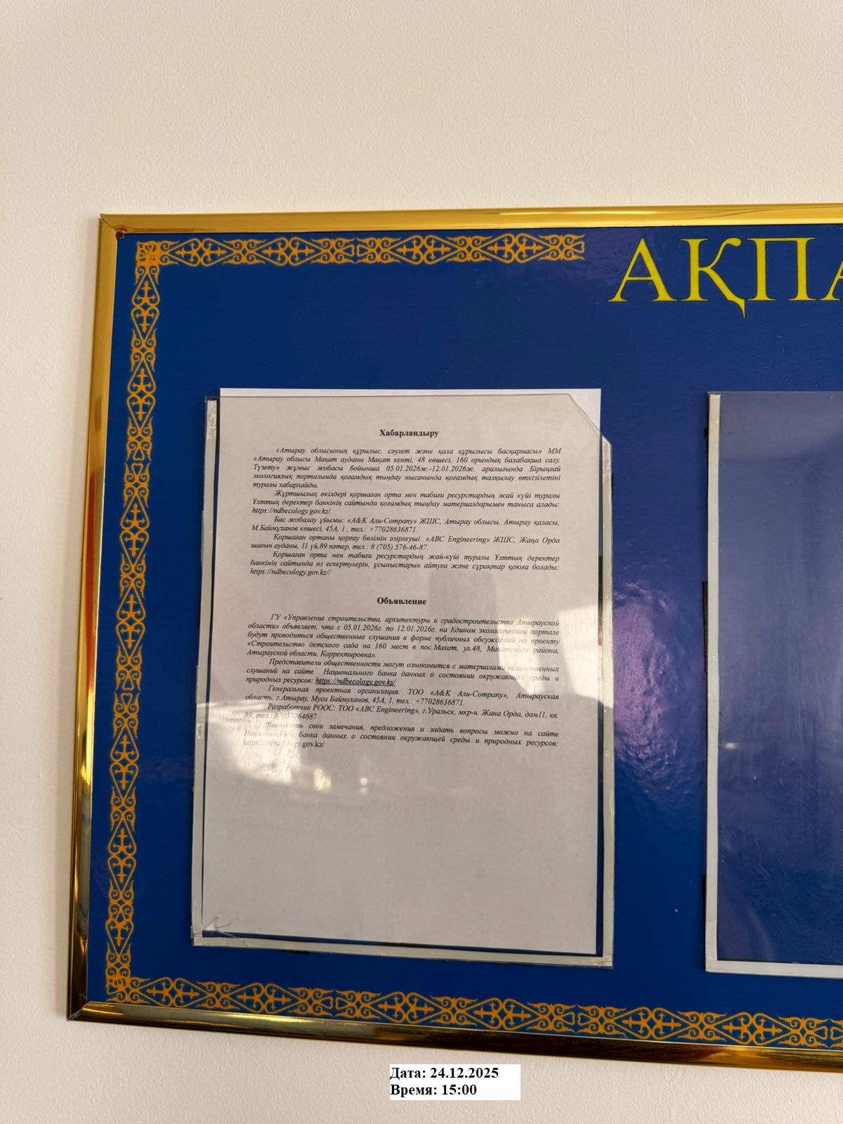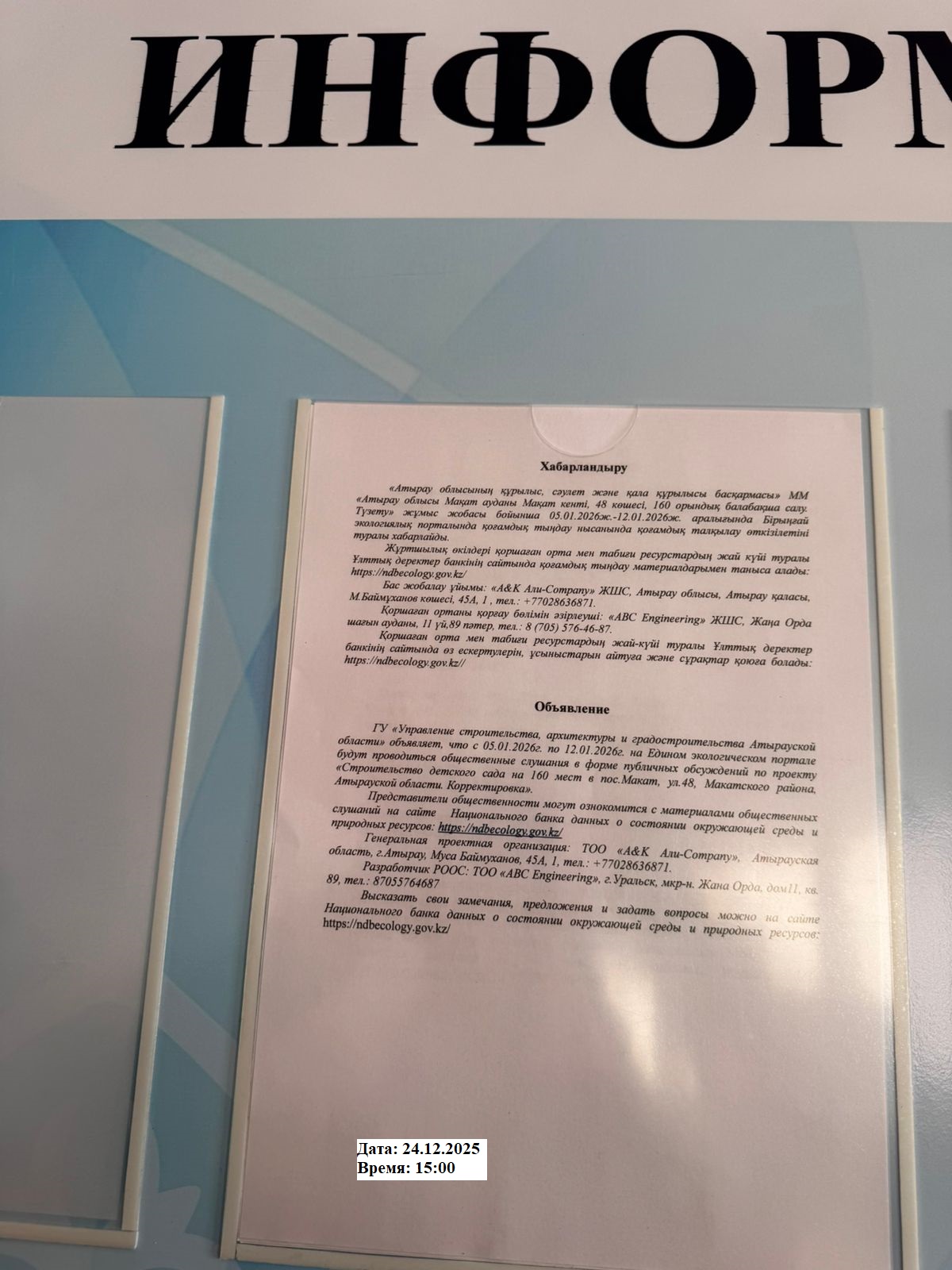 По проекту: «Строительство детского сада на 160 мест в пос.Макат, ул.48, Макатского района, Атырауской области. Корректировка»