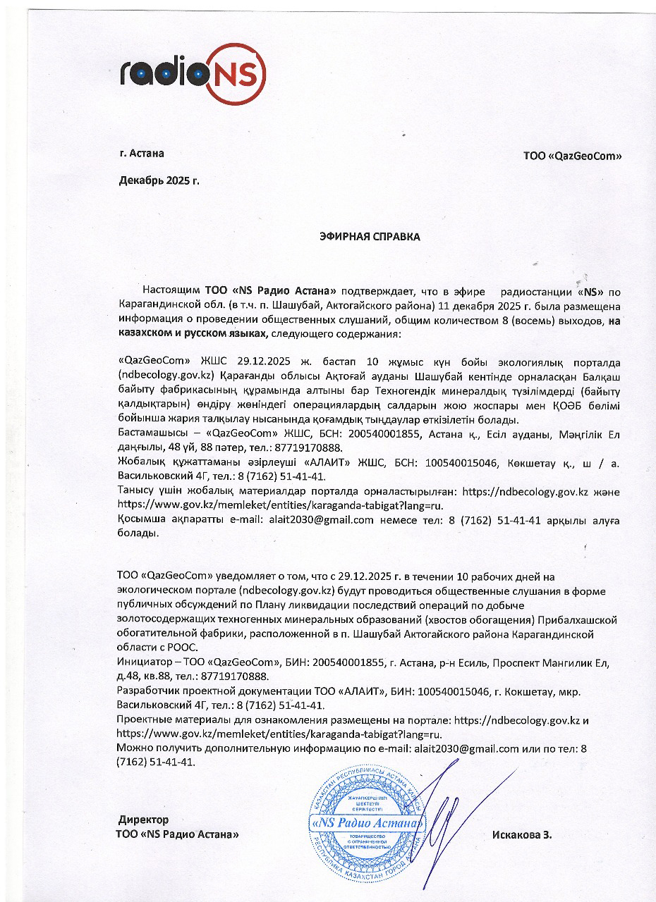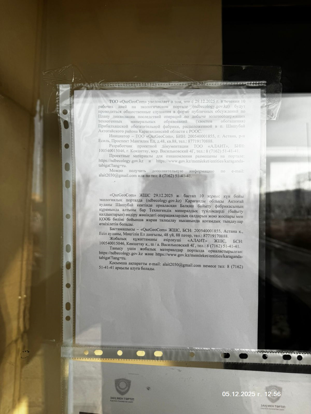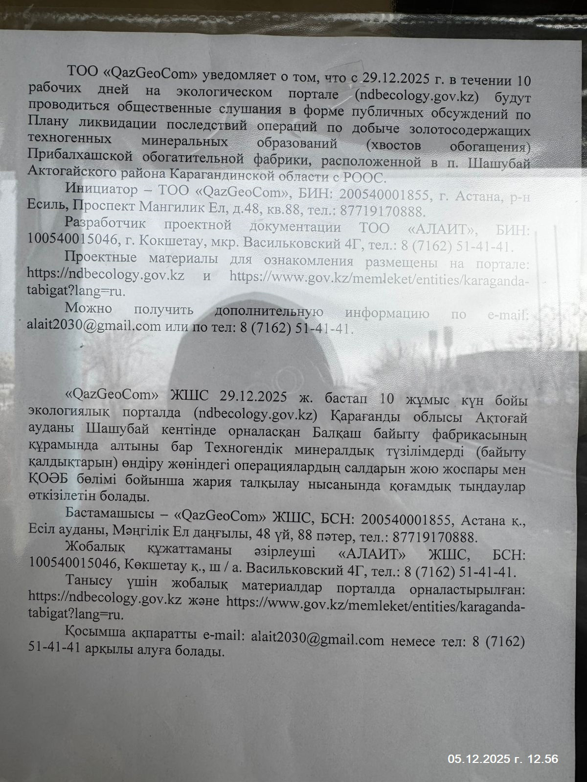 По проекту: План ликвидации последствий операций по добыче золотосодержащих техногенных минеральных образований (хвостов обогащения) Прибалхашской обогатительной фабрики, расположенной в п. Шашубай Актогайского района Карагандинской области с РООС