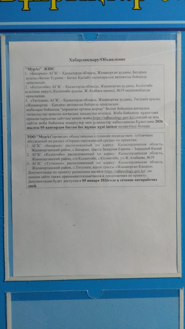 По проекту: АГЗС «Бесарык» расположенный по адресу: Кызылординская область, Жанакорганский район, с.Бесарык, трасса Западная Европа – Западный Кытай