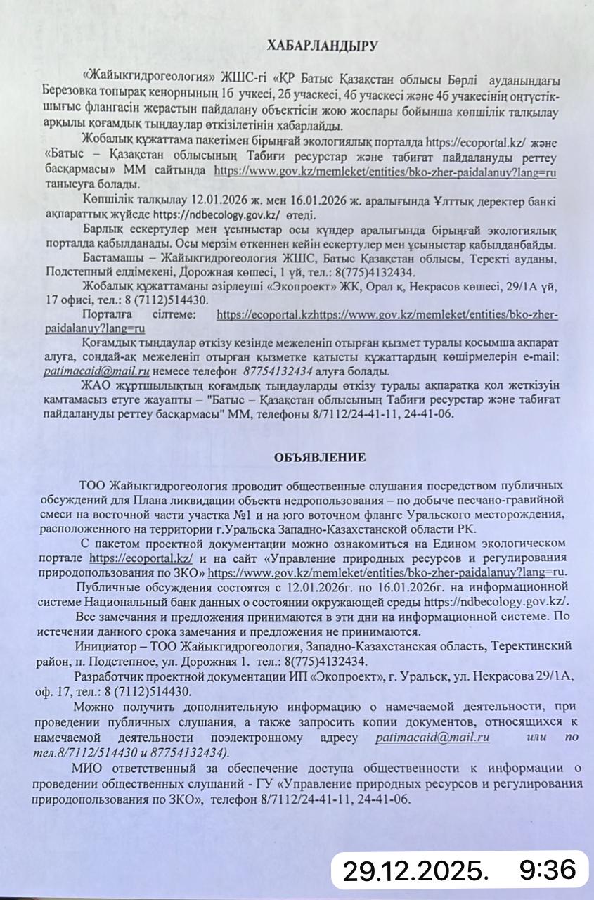 По проекту: План ликвидации объекта недропользования – по добыче песчано-гравийной смеси на восточной части участка №1 и на юго воточном фланге Уральского месторождения, расположенного на территории г.Уральска Западно-Казахстанской области РК.