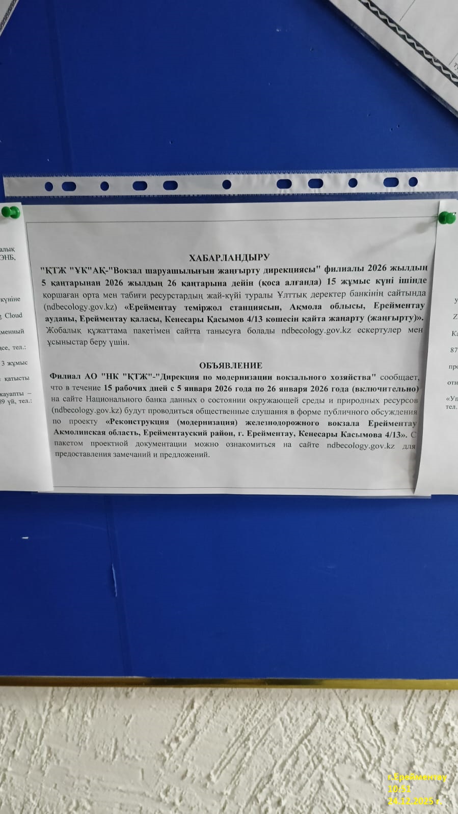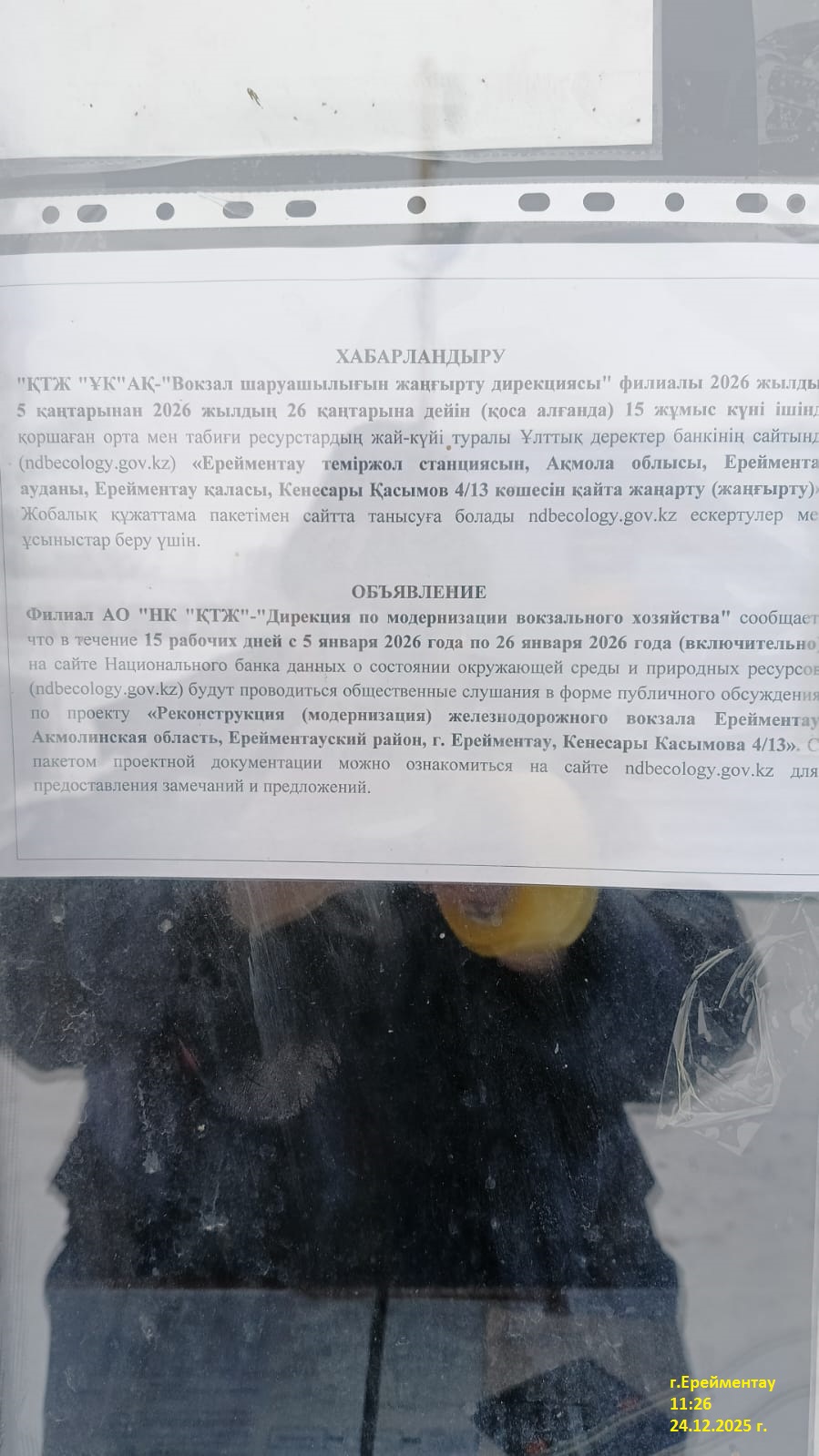 По проекту: Реконструкция (модернизация) железнодорожного вокзала Ерементау Акмолинской области, Ерейментауский район, г. Ерейментау, Кенесары Касымова 4/13