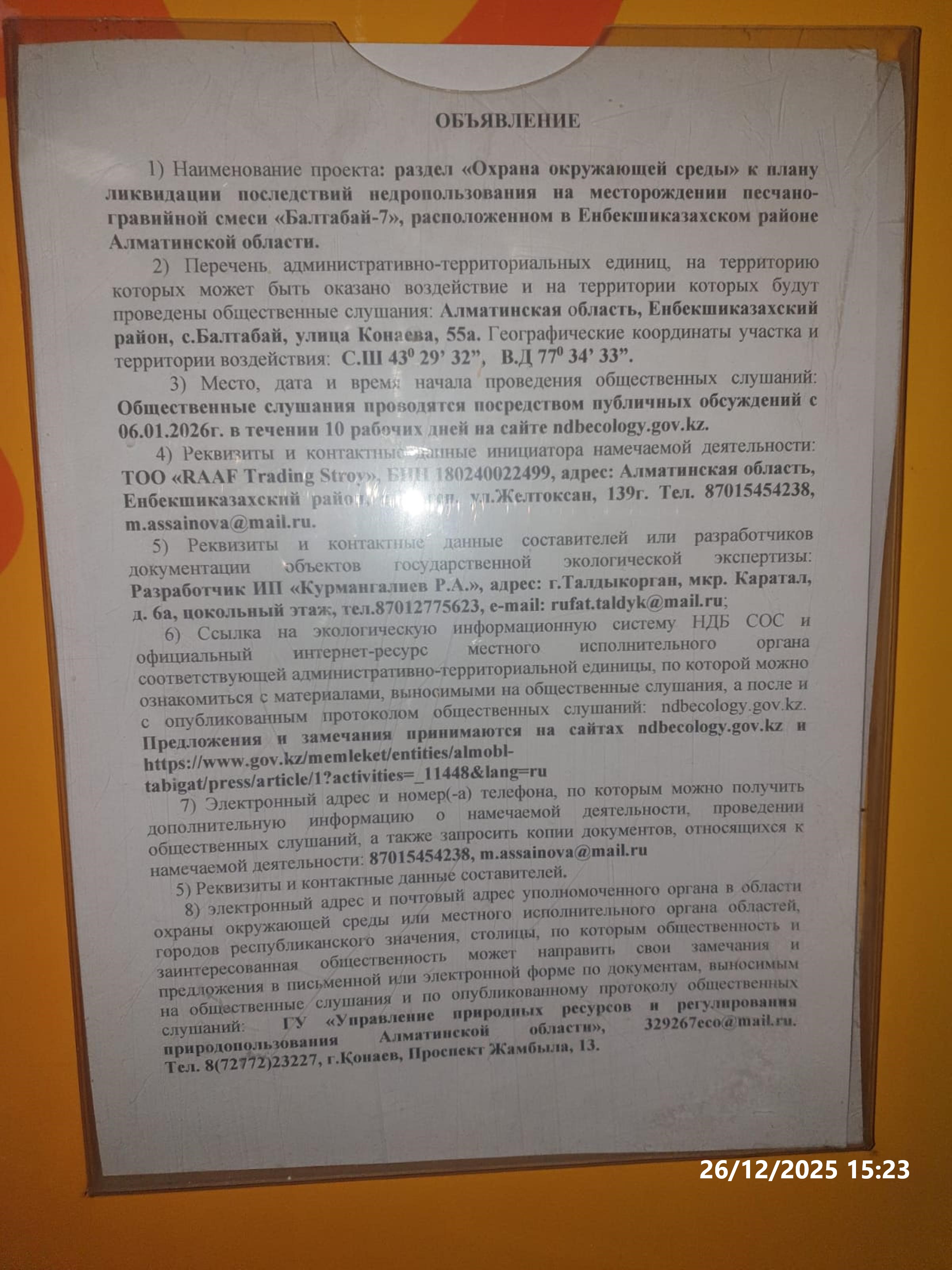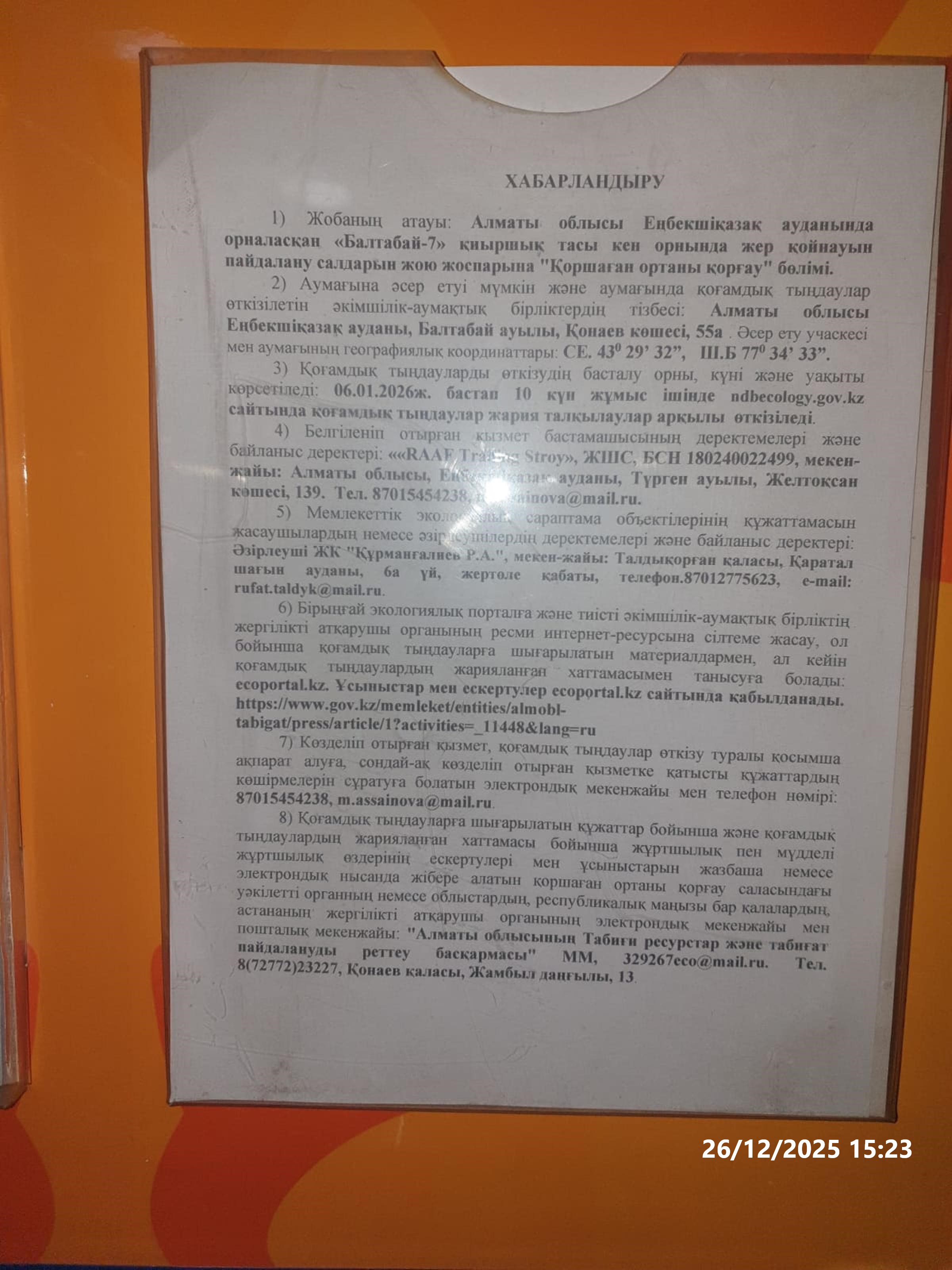 По проекту: План ликвидации последствий недропользования по добыче песчано-гравийной смеси на месторождении «Балтабай-7», расположенном в Енбекшиказахском районе Алматинской области